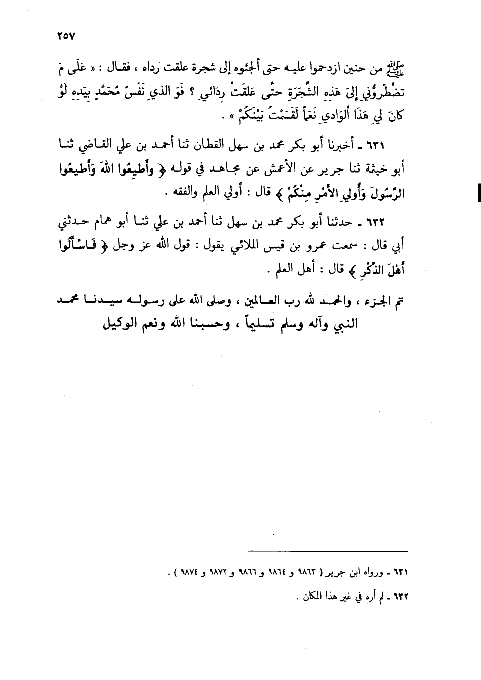 631 - أَخْبَرَنَا أَبُو بَكْرٍ مُحَمَّدُ بْنُ سَهْلٍ الْقَطَّانُ، ثنا أَحْمَدُ بْنُ عَلِيٍّ الْقَاضِي، ثنا أَبُو خَيْثَمَةَ، ثنا جَرِيرٌ، عَنِ الْأَعْمَشِ، عَنْ مُجَاهِدٍ، فِي قَوْلِهِ: {§أَطِيعُوا اللَّهَ وَأَطِيعُوا الرَّسُولَ وَأُولِي الْأَمْرِ مِنْكُمْ} [النساء: 59] قَالَ: «أُولِي الْعِلْمِ وَالْفِقْهِ»