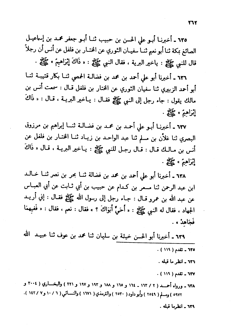 636 - أَخْبَرَنَا أَبُو عَلِيٍّ أَحْمَدُ بْنُ مُحَمَّدِ بْنِ فَضَالَةَ الْحِمْصِيُّ، ثنا بَكَّارُ بْنُ قُتَيْبَةَ، ثنا أَبُو أَحْمَدَ الزُّبَيْرِيُّ، ثنا سُفْيَانُ الثَّوْرِيُّ، عَنِ الْمُخْتَارِ بْنِ فُلْفُلٍ، قَالَ: سَمِعْتُ أَنَسَ بْنَ مَالِكٍ، يَقُولُ: جَاءَ رَجُلٌ إِلَى النَّبِيِّ صَلَّى اللهُ عَلَيْهِ وَسَلَّمَ فَقَالَ: يَا خَيْرَ الْبَرِيَّةِ، قَالَ: §«ذَاكَ إِبْرَاهِيمُ صَلَّى اللهُ عَلَيْهِ وَسَلَّمَ»