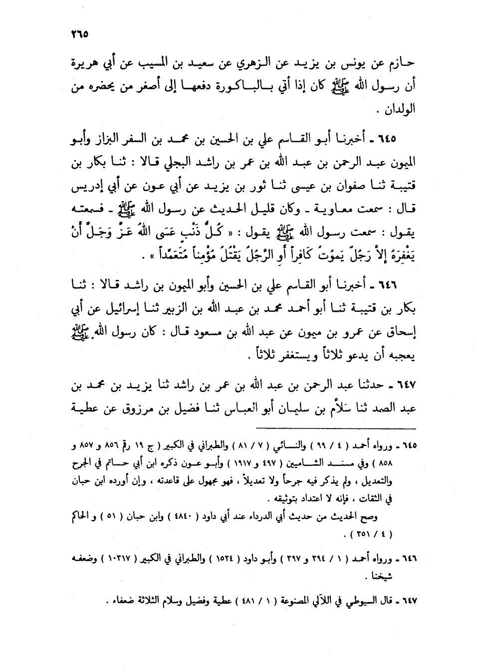 645 - أَخْبَرَنَا أَبُو الْقَاسِمِ عَلِيُّ بْنُ الْحُسَيْنِ بْنِ مُحَمَّدِ بْنِ السَّفَرِ الْبَزَّازُ، وَأَبُو الْمَيْمُونِ عَبْدُ الرَّحْمَنِ بْنُ عَبْدِ اللَّهِ بْنِ عُمَرَ بْنِ رَاشِدٍ الْبَجَلِيُّ، قَالَا: ثنا بَكَّارُ بْنُ قُتَيْبَةَ، ثنا صَفْوَانُ بْنُ عِيسَى، ثنا ثَوْرُ بْنُ يَزِيدَ، عَنْ أَبِي عَوْنٍ، عَنْ أَبِي إِدْرِيسَ، قَالَ: سَمِعْتُ مُعَاوِيَةَ، وَكَانَ قَلِيلَ الْحَدِيثِ عَنْ رَسُولِ اللَّهِ صَلَّى اللهُ عَلَيْهِ وَسَلَّمَ فَسَمِعْتُهُ - يَقُولُ: سَمِعْتُ رَسُولَ اللَّهِ صَلَّى اللهُ عَلَيْهِ وَسَلَّمَ يَقُولُ: §«كُلُّ ذَنْبٍ عَسَى اللَّهُ عَزَّ وَجَلَّ أَنْ يَغْفِرَهُ إِلَّا رَجُلٌ يَمُوتُ كَافِرًا أَوِ الرَّجُلُ يَقْتُلُ مُؤْمِنًا مُتَعَمِّدًا»