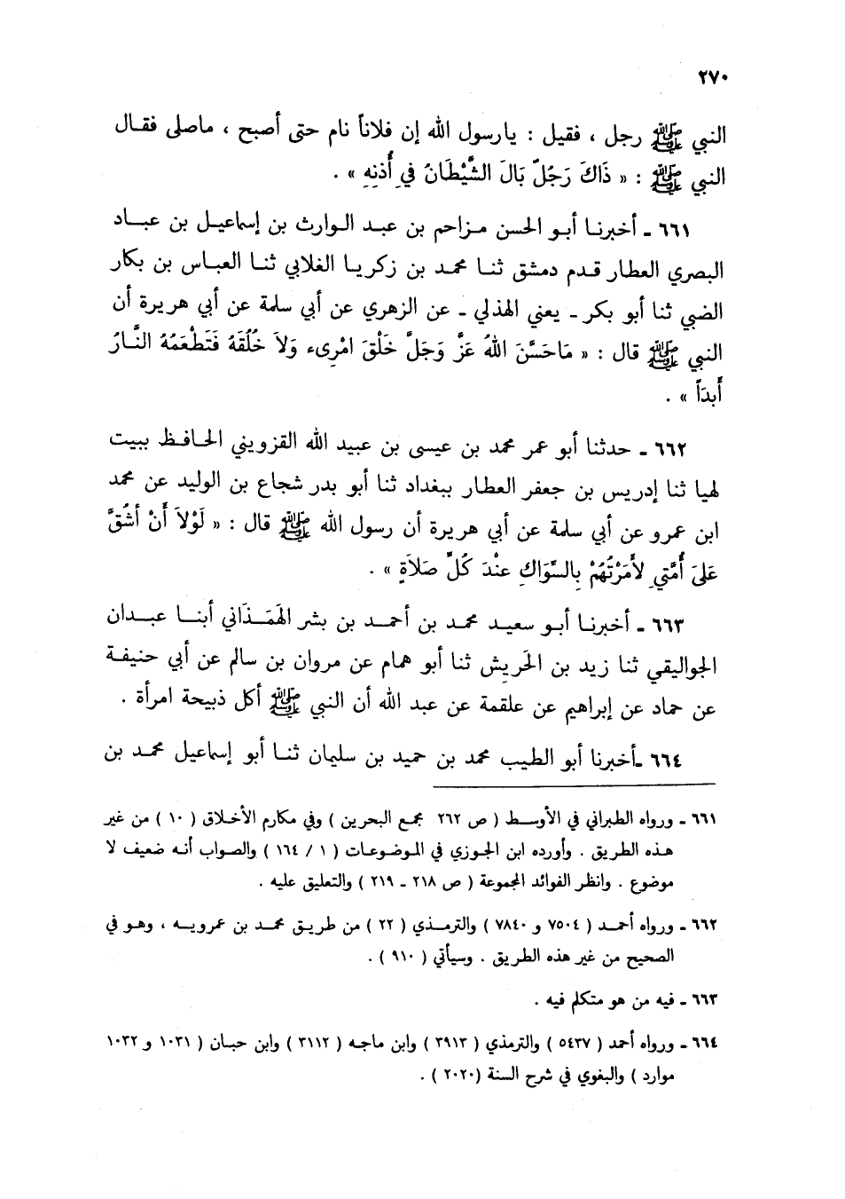 662 - حَدَّثَنَا أَبُو عُمَرَ مُحَمَّدُ بْنُ عِيسَى بْنِ عُبَيْدِ اللَّهِ الْقَزْوِينِيُّ الْحَافِظُ بِبَيْتِ لَهْيَا، ثنا إِدْرِيسُ بْنُ جَعْفَرٍ الْعَطَّارُ، بِبَغْدَادَ، ثنا أَبُو بَدْرٍ شُجَاعُ بْنُ الْوَلِيدِ، عَنْ مُحَمَّدِ بْنِ عَمْرٍو، عَنْ أَبِي سَلَمَةَ، عَنْ أَبِي هُرَيْرَةَ، أَنَّ رَسُولَ اللَّهِ صَلَّى اللهُ عَلَيْهِ وَسَلَّمَ قَالَ: §«لَوْلَا أَنْ أَشُقَّ عَلَى أُمَّتِي لَأَمَرْتُهُمْ بِالسِّوَاكِ عِنْدَ كُلِّ صَلَاةٍ»