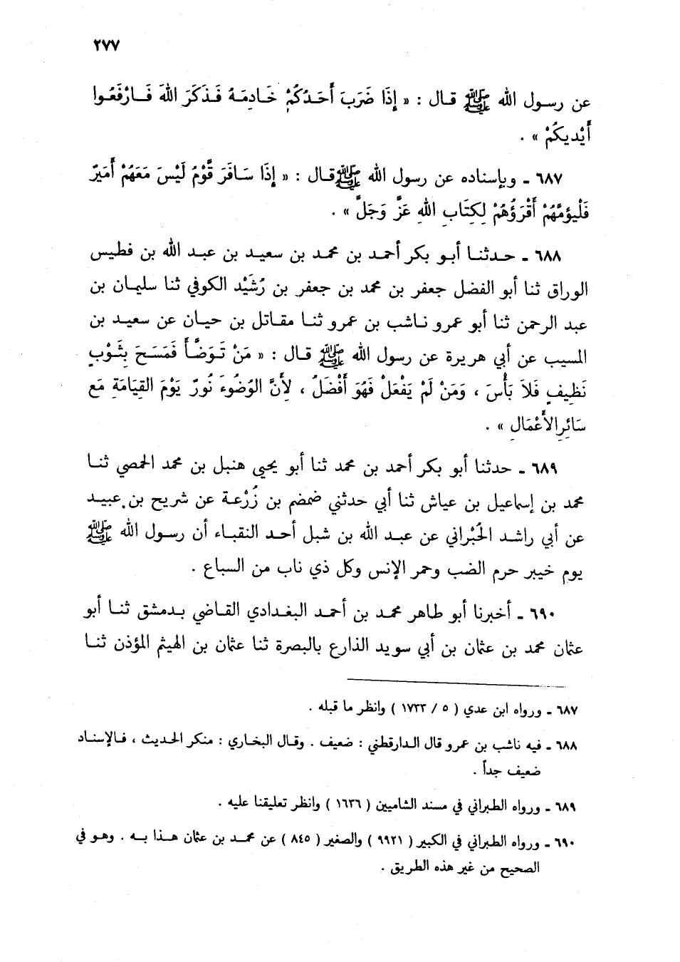 688 - حَدَّثَنَا أَبُو بَكْرٍ أَحْمَدُ بْنُ مُحَمَّدِ بْنِ سَعِيدِ بْنِ عَبْدِ اللَّهِ بْنِ فُطَيْسٍ الْوَرَّاقُ، ثنا أَبُو الْفَضْلِ جَعْفَرُ بْنُ مُحَمَّدِ بْنِ جَعْفَرِ بْنِ رُشَيْدٍ الْكُوفِيُّ، ثنا سُلَيْمَانُ بْنُ عَبْدِ الرَّحْمَنِ، ثنا أَبُو عَمْرٍو نَاشِبُ بْنُ عَمْرٍو، ثنا مُقَاتِلُ بْنُ حَيَّانَ، عَنْ سَعِيدِ بْنِ الْمُسَيِّبِ، عَنْ أَبِي هُرَيْرَةَ، عَنْ رَسُولِ اللَّهِ صَلَّى اللهُ عَلَيْهِ وَسَلَّمَ قَالَ: «§مَنْ تَوَضَّأَ فَمَسَحَ بِثَوْبٍ نَظِيفٍ فَلَا بَأْسَ، وَمَنْ لَمْ يَفْعَلْ فَهُوَ أَفْضَلُ لِأَنَّ الْوُضُوءَ نُورٌ يَوْمَ الْقِيَامَةِ مَعَ سَائِرِ الْأَعْمَالِ»