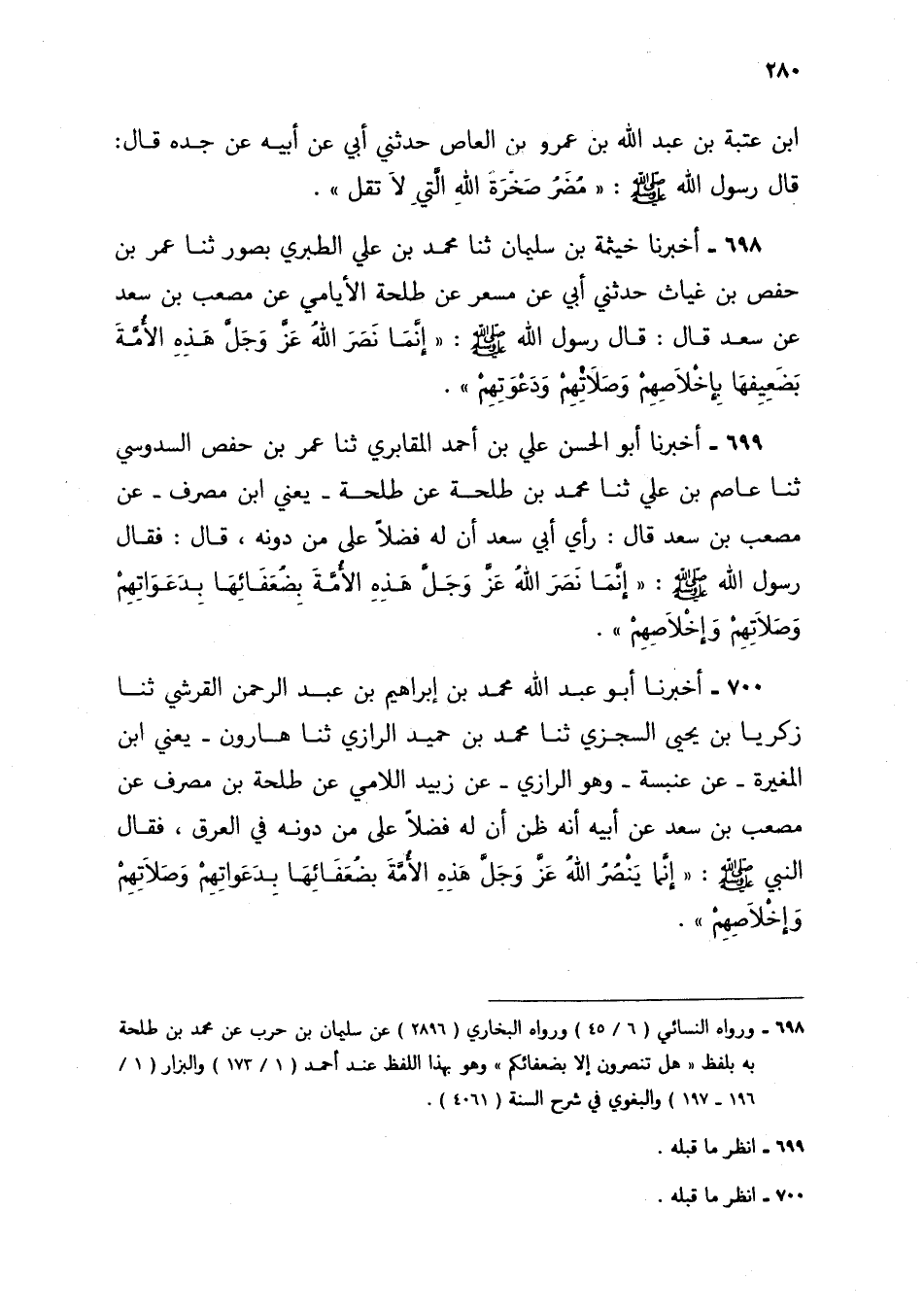 699 - أَخْبَرَنَا أَبُو الْحَسَنِ عَلِيُّ بْنُ أَحْمَدَ الْمَقَابِرِيُّ، ثنا عُمَرُ بْنُ حَفْصٍ السَّدُوسِيُّ، ثنا عَاصِمُ بْنُ عَلِيٍّ، ثنا مُحَمَّدُ بْنُ طَلْحَةَ، عَنْ طَلْحَةَ يَعْنِي ابْنَ مُصَرِّفٍ، عَنْ مُصْعَبِ بْنِ سَعْدٍ، قَالَ: رَأَى أَبِي سَعْدٌ أَنَّ لَهُ فَضْلًا عَلَى مَنْ دُونَهُ قَالَ: فَقَالَ رَسُولُ اللَّهِ صَلَّى اللهُ عَلَيْهِ وَسَلَّمَ: «إِنَّمَا §نَصَرَ اللَّهُ عَزَّ وَجَلَّ هَذِهِ الْأُمَّةَ بِضُعَفَائِهَا بِدَعَوَاتِهِمْ وَصَلَاتِهِمْ وَإِخْلَاصِهِمْ»