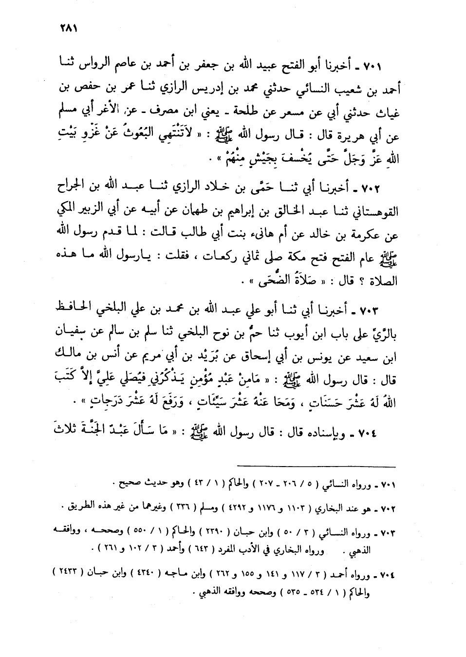 701 - أَخْبَرَنَا أَبُو الْفَتْحِ عُبَيْدُ اللَّهِ بْنُ جَعْفَرِ بْنِ أَحْمَدَ بْنِ عَاصِمٍ الرَّوَّاسُ، ثنا أَحْمَدُ بْنُ شُعَيْبٍ النَّسَائِيُّ، حَدَّثَنِي مُحَمَّدُ بْنُ إِدْرِيسَ الرَّازِيُّ، ثنا عُمَرُ بْنُ حَفْصِ بْنِ غِيَاثٍ، حَدَّثَنِي أَبِي، عَنْ مِسْعَرٍ، عَنْ طَلْحَةَ يَعْنِي ابْنَ مُصَرِّفٍ، عَنِ الْأَغَرِّ أَبِي مُسْلِمٍ، عَنْ أَبِي هُرَيْرَةَ، قَالَ: قَالَ رَسُولُ اللَّهِ صَلَّى اللهُ عَلَيْهِ وَسَلَّمَ: §«لَا تَنْتَهِي الْبُعُوثُ عَنْ غَزْوِ بَيْتِ اللَّهِ عَزَّ وَجَلَّ حَتَّى يُخْسَفَ بِجَيْشٍ مِنْهُمْ»