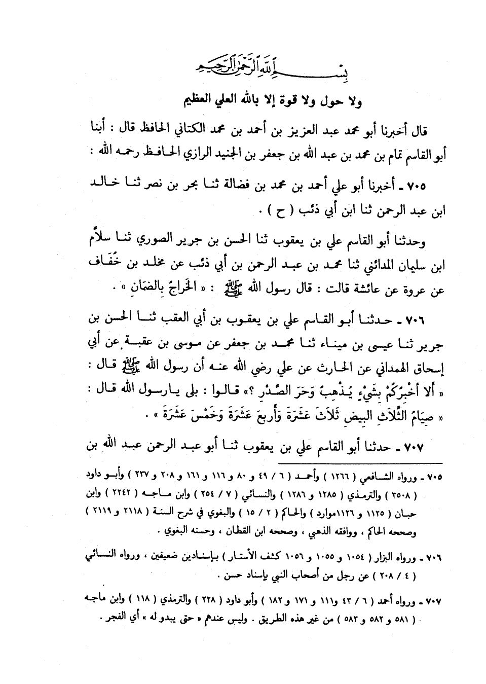 705 - أَخْبَرَنَا أَبُو عَلِيٍّ أَحْمَدُ بْنُ مُحَمَّدِ بْنِ فَضَالَةَ، ثنا بَحْرُ بْنُ نَصْرٍ، ثنا خَالِدُ بْنُ عَبْدِ الرَّحْمَنِ، ثنا ابْنُ أَبِي ذِئْبٍ، ح وَحَدَّثَنَا أَبُو الْقَاسِمِ عَلِيُّ بْنُ يَعْقُوبَ، ثنا الْحَسَنُ بْنُ جَرِيرٍ الصُّورِيُّ، ثنا سَلَّامُ بْنُ سُلَيْمَانَ الْمَدَائِنِيُّ، ثنا مُحَمَّدُ بْنُ عَبْدِ الرَّحْمَنِ بْنِ أَبِي ذِئْبٍ، عَنْ مَخْلَدِ بْنِ خُفَافٍ، عَنْ عُرْوَةَ، عَنْ عَائِشَةَ، قَالَتْ: قَالَ رَسُولُ اللَّهِ صَلَّى اللهُ عَلَيْهِ وَسَلَّمَ: §«الْخَرَاجُ بِالضَّمَانِ»