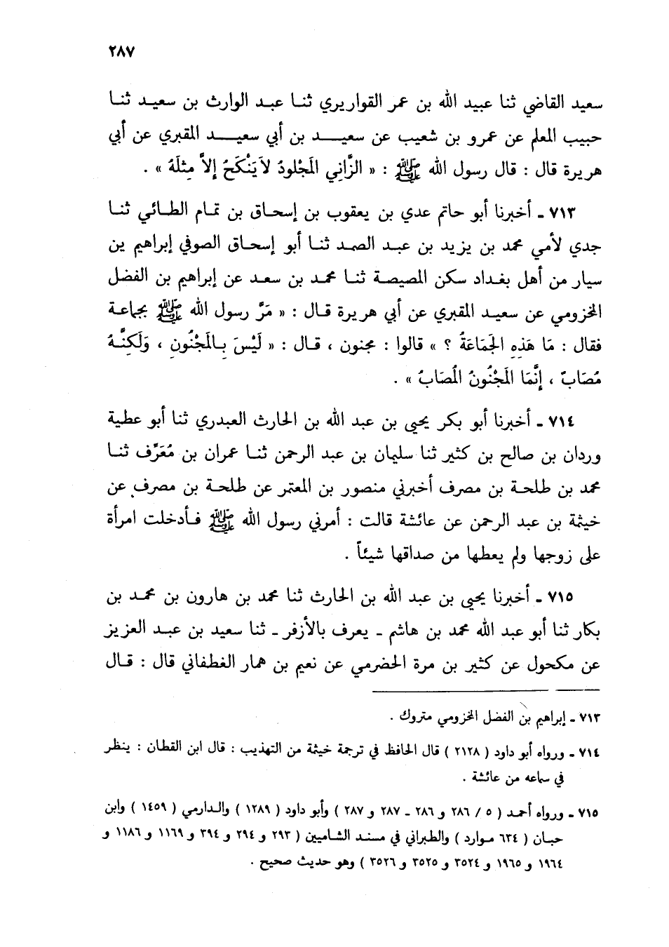 713 - أَخْبَرَنَا أَبُو حَاتِمٍ عَدِيُّ بْنُ يَعْقُوبَ بْنِ إِسْحَاقَ بْنِ تَمَّامٍ الطَّائِيُّ، ثنا جَدِّي لِأُمِّي مُحَمَّدُ بْنُ يَزِيدَ بْنِ عَبْدِ الصَّمَدِ، ثنا أَبُو إِسْحَاقَ الصُّوفِيُّ إِبْرَاهِيمُ بْنُ سَيَّارٍ مِنْ أَهْلِ بَغْدَادَ سَكَنَ الْمَصِيصَةَ، ثنا مُحَمَّدُ بْنُ سَعْدٍ، عَنْ إِبْرَاهِيمَ بْنِ الْفَضْلِ الْمَخْزُومِيِّ، عَنْ سَعِيدٍ الْمَقْبُرِيِّ، عَنْ أَبِي هُرَيْرَةَ، قَالَ: مَرَّ رَسُولُ اللَّهِ صَلَّى اللهُ عَلَيْهِ وَسَلَّمَ بِجَمَاعَةٍ فَقَالَ: «مَا هَذِهِ الْجَمَاعَةُ؟» قَالُوا: مَجْنُونٌ، قَالَ: «§لَيْسَ بِالْمَجْنُونِ، وَلَكِنَّهُ مُصَابٌ، إِنَّمَا الْمَجْنُونُ الْمُصَابُ»