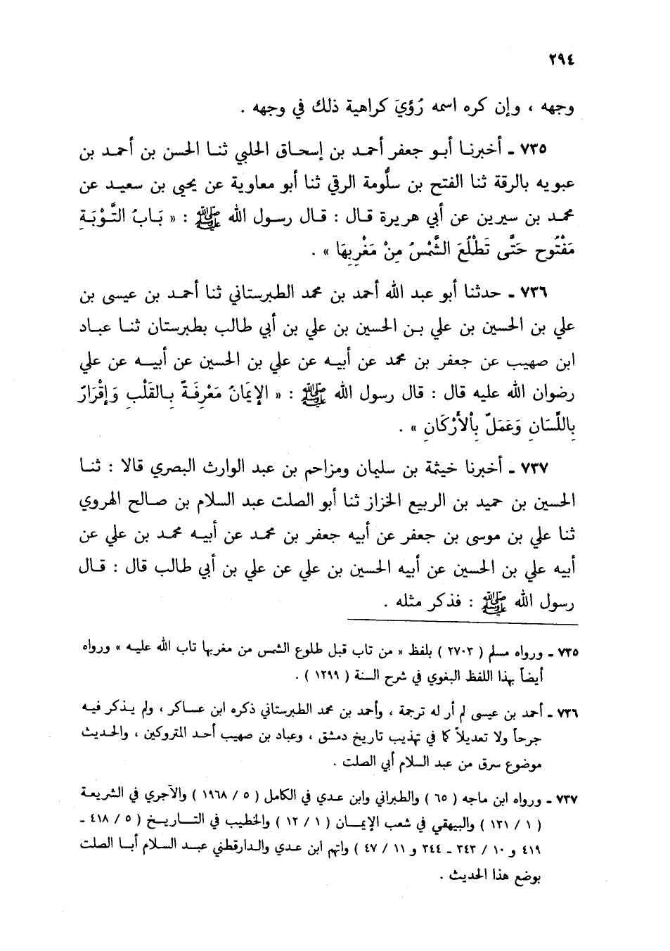 736 - حَدَّثَنَا أَبُو عَبْدِ اللَّهِ أَحْمَدُ بْنُ مُحَمَّدٍ الطَّبَرَسْتَانِيُّ، ثنا أَحْمَدُ بْنُ عِيسَى بْنِ عَلِيِّ بْنِ الْحُسَيْنِ بْنِ عَلِيِّ بْنِ الْحُسَيْنِ بْنِ عَلِيِّ بْنِ أَبِي طَالِبٍ، بِطَبَرِسْتَانَ، ثنا عَبَّادُ بْنُ صُهَيْبٍ، عَنْ جَعْفَرِ بْنِ مُحَمَّدٍ، عَنْ أَبِيهِ، عَنْ عَلِيِّ بْنِ الْحُسَيْنِ، عَنْ أَبِيهِ، عَنْ عَلِيٍّ رِضْوَانُ اللَّهِ عَلَيْهِ، قَالَ: قَالَ رَسُولُ اللَّهِ صَلَّى اللهُ عَلَيْهِ وَسَلَّمَ: «§الْإِيمَانُ مَعْرِفَةٌ بِالْقَلْبِ وَإِقْرَارٌ بِاللِّسَانِ وَعَمَلٌ بِالْأَرْكَانِ» ،