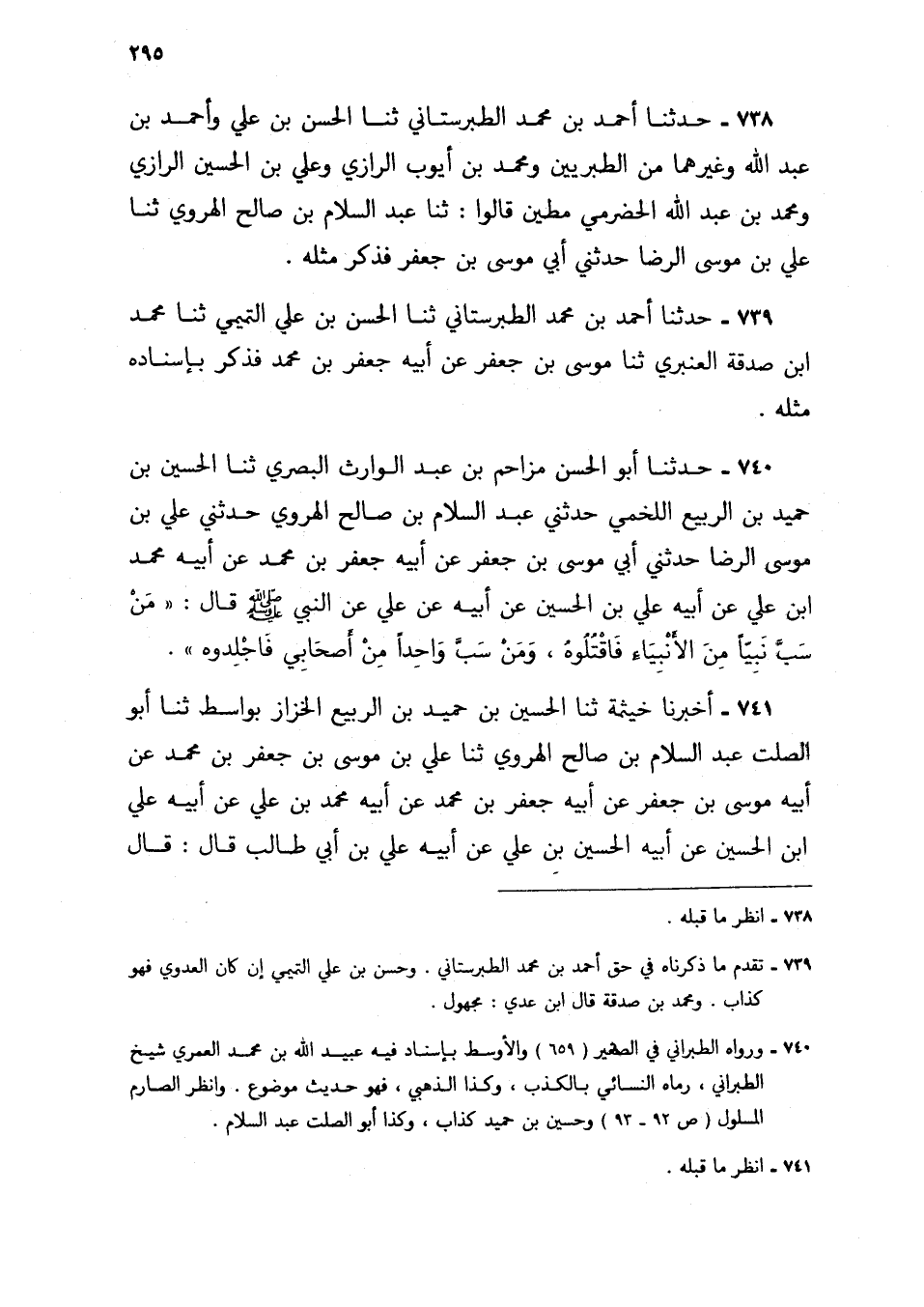 740 - حَدَّثَنَا أَبُو الْحَسَنِ مُزَاحِمُ بْنُ عَبْدِ الْوَارِثِ الْبَصْرِيُّ، ثنا الْحُسَيْنُ بْنُ حُمَيْدِ بْنِ الرَّبِيعِ اللَّخْمِيُّ، حَدَّثَنِي عَبْدُ السَّلَامِ بْنُ صَالِحٍ الْهَرَوِيُّ، حَدَّثَنِي عَلِيُّ بْنُ مُوسَى الرِّضَا، حَدَّثَنِي أَبِي مُوسَى بْنُ جَعْفَرٍ، عَنْ أَبِيهِ جَعْفَرِ بْنِ مُحَمَّدٍ، عَنْ أَبِيهِ مُحَمَّدِ بْنِ عَلِيٍّ، عَنْ أَبِيهِ عَلِيِّ بْنِ الْحُسَيْنِ، عَنْ أَبِيهِ، عَنْ عَلِيٍّ عَنِ النَّبِيِّ صَلَّى اللهُ عَلَيْهِ وَسَلَّمَ قَالَ: «§مَنْ سَبَّ نَبِيًّا مِنَ الْأَنْبِيَاءِ فَاقْتُلُوهُ، وَمَنْ سَبَّ وَاحِدًا مِنْ أَصْحَابِي فَاجْلِدُوهُ»