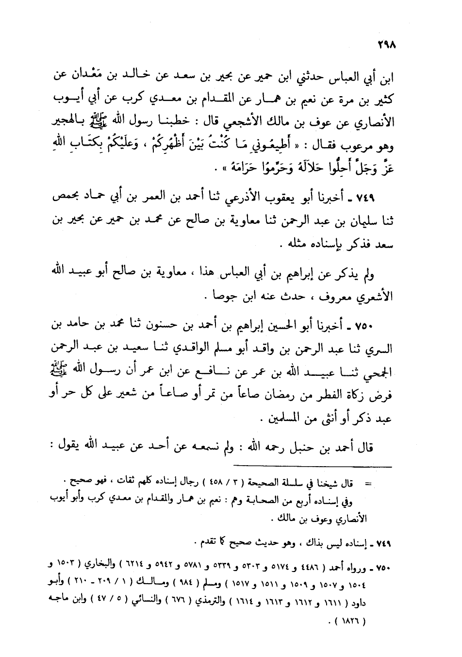 750 - أَخْبَرَنَا أَبُو الْحُسَيْنِ إِبْرَاهِيمُ بْنُ أَحْمَدَ بْنِ حَسَنُونَ، ثنا مُحَمَّدُ بْنُ حَامِدِ بْنِ السَّرِيِّ، ثنا عَبْدُ الرَّحْمَنِ بْنُ وَاقِدٍ أَبُو مُسْلِمٍ الْوَاقِدِيُّ، ثنا سَعِيدُ بْنُ عَبْدِ الرَّحْمَنِ الْجُمَحِيُّ، ثنا عُبَيْدُ اللَّهِ بْنُ عُمَرَ بْنِ نَافِعٍ، عَنِ ابْنِ عُمَرَ: «أَنَّ رَسُولَ اللَّهِ صَلَّى اللهُ عَلَيْهِ وَسَلَّمَ §فَرَضَ زَكَاةَ الْفِطْرِ مِنْ رَمَضَانَ صَاعًا مِنْ تَمْرٍ، أَوْ صَاعًا مِنْ شَعِيرٍ عَلَى كُلِّ حُرٍّ أَوْ عَبْدٍ ذَكَرٍ أَوْ أُنْثَى مِنَ الْمُسْلِمِينَ» قَالَ أَحْمَدُ بْنُ حَنْبَلٍ رَحِمَهُ اللَّهُ: " وَلَمْ نَسْمَعْهُ عَنْ أَحَدٍ، عَنْ عُبَيْدِ اللَّهِ، يَقُولُ -[299]-: مِنَ الْمُسْلِمِينَ غَيْرِ سَعِيدِ بْنِ عَبْدِ الرَّحْمَنِ " قِيلَ لِأَبِي عَبْدِ اللَّهِ رَحِمَهُ اللَّهُ: مَنْ عَنِ الْجُمَحِيِّ؟ قَالَ: «الْهَاشِمِيُّ»