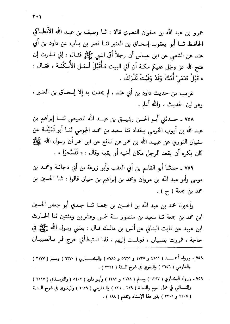 759 - حَدَّثَنَا أَبُو الْقَاسِمِ بْنُ أَبِي الْعَقِبِ، وَأَبُو زُرْعَةَ بْنُ أَبِي دُجَانَةَ، وَمُحَمَّدُ بْنُ مُوسَى، وَأَبُو عَبْدِ اللَّهِ بْنُ مَرْوَانَ، وَمُحَمَّدُ بْنُ إِبْرَاهِيمَ بْنِ حَيَّانَ، قَالُوا: ثنا الْحُسَيْنُ بْنُ مُحَمَّدِ بْنِ جُمُعَةَ، ح وَأَخْبَرَنَا مُحَمَّدُ بْنُ عَبْدِ اللَّهِ بْنِ الْحُسَيْنِ بْنِ جُمُعَةَ، ثنا جَدِّي أَبُو جَعْفَرٍ الْحُسَيْنُ بْنُ مُحَمَّدِ بْنِ جُمُعَةَ، ثنا سَعِيدُ بْنُ مَنْصُورٍ، سَنَةَ خَمْسٍ وَعِشْرِينَ وَمِائَتَيْنِ، ثنا الْحَارِثُ بْنُ عُبَيْدٍ، عَنْ ثَابِتٍ الْبُنَانِيِّ، عَنْ أَنَسِ بْنِ مَالِكٍ، قَالَ: §«بَعَثَنِي رَسُولُ اللَّهِ صَلَّى اللهُ عَلَيْهِ وَسَلَّمَ فِي حَاجَةٍ فَمَرَرْتُ بِصِبْيَانٍ فَجَلَسْتُ إِلَيْهِمْ، فَلَمَّا اسْتَبْطَأَنِي خَرَجَ فَمَرَّ بِالصِّبْيَانِ -[302]- فَسَلَّمَ عَلَيْهِمْ صَلَّى اللهُ عَلَيْهِ وَسَلَّمَ»