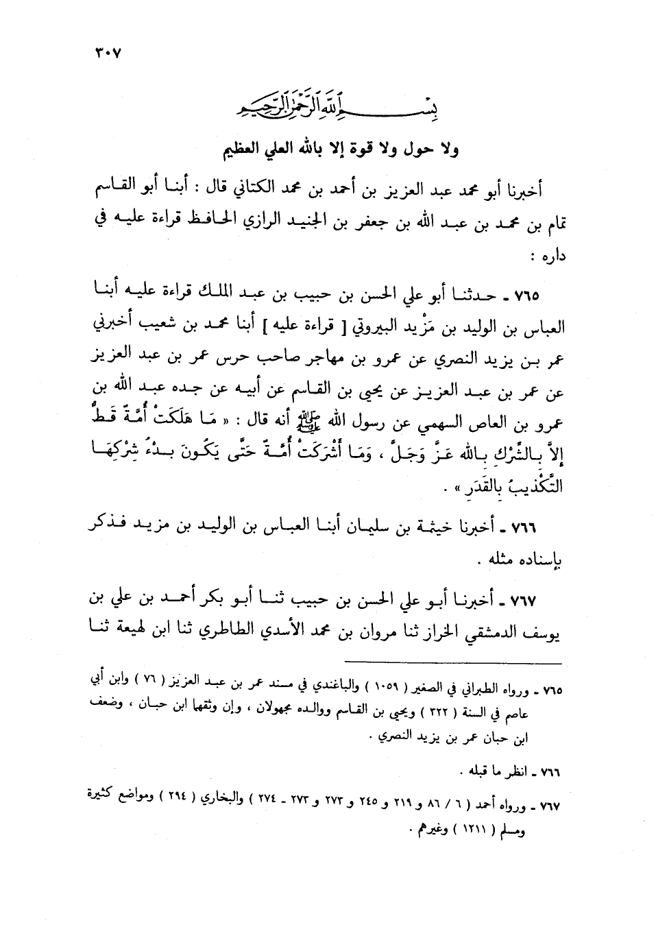 765 - حَدَّثَنَا أَبُو عَلِيٍّ الْحَسَنُ بْنُ حَبِيبِ بْنِ عَبْدِ الْمَلِكِ قِرَاءَةً عَلَيْهِ، أبنا الْعَبَّاسُ بْنُ الْوَلِيدِ بْنِ مَزْيَدٍ الْبَيْرُوتِيُّ قِرَاءَةً عَلَيْهِ، أبنا مُحَمَّدُ بْنُ شُعَيْبٍ، أَخْبَرَنِي عُمَرُ بْنُ يَزِيدَ النَّصْرِيُّ، عَنْ عَمْرِو بْنِ مُهَاجِرٍ، صَاحِبِ حَرَسِ عُمَرَ بْنِ عَبْدِ الْعَزِيزِ، عَنْ عُمَرَ بْنِ عَبْدِ الْعَزِيزِ، عَنْ يَحْيَى بْنِ الْقَاسِمِ، عَنْ أَبِيهِ، عَنْ جَدِّهِ عَبْدِ اللَّهِ بْنِ عَمْرِو بْنِ الْعَاصِ السَّهْمِيِّ، عَنْ رَسُولِ اللَّهِ صَلَّى اللهُ عَلَيْهِ وَسَلَّمَ أَنَّهُ قَالَ: «§مَا هَلَكَتْ أُمَّةٌ قَطُّ إِلَّا بِالشِّرْكِ بِاللَّهِ عَزَّ وَجَلَّ، وَمَا أَشْرَكَتْ أُمَّةٌ حَتَّى يَكُونَ بَدْءُ شِرْكِهَا التَّكْذِيبَ بِالْقَدَرِ» ،