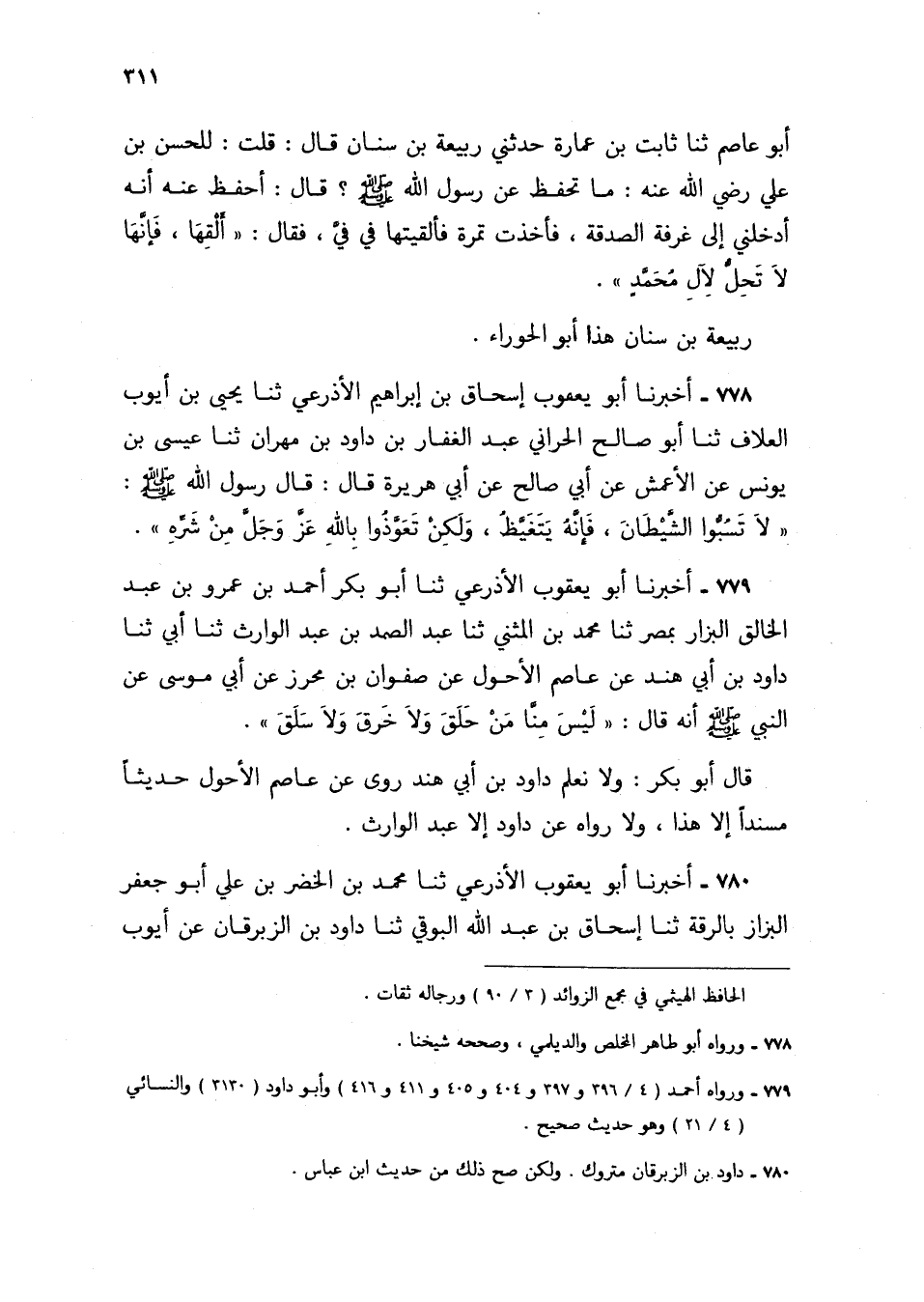 779 - أَخْبَرَنَا أَبُو يَعْقُوبَ الْأَذْرَعِيُّ، ثنا أَبُو بَكْرٍ أَحْمَدُ بْنُ عَمْرِو بْنِ عَبْدِ الْخَالِقِ الْبَزَّارُ بِمِصْرَ، ثنا مُحَمَّدُ بْنُ الْمُثَنَّى، ثنا عَبْدُ الصَّمَدِ بْنُ عَبْدِ الْوَارِثِ، ثنا أَبِي، ثنا دَاوُدُ بْنُ أَبِي هِنْدٍ، عَنْ عَاصِمٍ الْأَحْوَلِ، عَنْ صَفْوَانَ بْنِ مُحْرِزٍ، عَنْ أَبِي مُوسَى عَنِ النَّبِيِّ صَلَّى اللهُ عَلَيْهِ وَسَلَّمَ أَنَّهُ قَالَ: §«لَيْسَ مِنَّا مَنْ حَلَقَ وَلَا خَرَقَ وَلَا سَلَقَ» قَالَ أَبُو بَكْرٍ: «وَلَا نَعْلَمُ دَاوُدَ بْنَ أَبِي هِنْدٍ رَوَى عَنْ عَاصِمٍ الْأَحْوَلِ حَدِيثًا مُسْنِدًا إِلَّا هَذَا، وَلَا رَوَاهُ عَنْ دَاوُدَ إِلَّا عَبْدُ الْوَارِثِ»