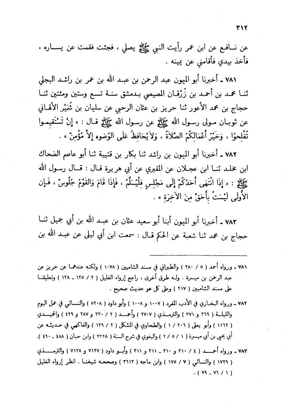 781 - أَخْبَرَنَا أَبُو الْمَيْمُونِ عَبْدُ الرَّحْمَنِ بْنُ عَبْدِ اللَّهِ بْنِ عُمَرَ بْنِ رَاشِدٍ الْبَجَلِيُّ، ثنا مُحَمَّدُ بْنُ أَحْمَدَ بْنِ زُرْقَانَ الْمِصِّيصِيُّ، بِدِمَشْقَ سَنَةَ تِسْعٍ وَسِتِّينَ وَمِائَتَيْنِ، ثنا حَجَّاجُ بْنُ مُحَمَّدٍ الْأَعْوَرُ، ثنا حَرِيزُ بْنُ عُثْمَانَ الرَّحَبِيُّ، عَنْ سُلَيْمَانَ بْنِ سُمَيْرٍ الْأَلْهَانِيِّ، عَنْ ثَوْبَانَ مَوْلَى رَسُولِ اللَّهِ صَلَّى اللهُ عَلَيْهِ وَسَلَّمَ، عَنْ رَسُولِ اللَّهِ صَلَّى اللهُ عَلَيْهِ وَسَلَّمَ قَالَ: «§إِنْ تَسْتَقِيمُوا تُفْلِحُوا، وَخَيْرُ أَعْمَالِكُمُ الصَّلَاةُ، وَلَا يُحَافِظُ عَلَى الْوُضُوءِ إِلَّا مُؤْمِنٌ»