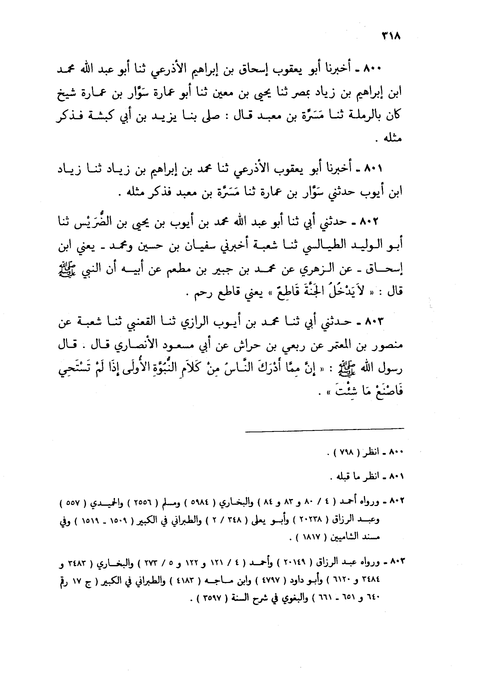 802 - حَدَّثَنِي أَبِي، ثنا أَبُو عَبْدِ اللَّهِ مُحَمَّدُ بْنُ أَيُّوبَ بْنِ يَحْيَى بْنِ الضُّرَيْسِ، ثنا أَبُو الْوَلِيدِ الطَّيَالِسِيُّ، ثنا شُعْبَةُ، أَخْبَرَنِي سُفْيَانُ بْنُ حُسَيْنٍ، وَمُحَمَّدٌ يَعْنِي ابْنَ إِسْحَاقَ، عَنِ الزُّهْرِيِّ، عَنْ مُحَمَّدِ بْنِ جُبَيْرِ بْنِ مُطْعِمٍ، عَنْ أَبِيهِ، أَنَّ النَّبِيَّ صَلَّى اللهُ عَلَيْهِ وَسَلَّمَ قَالَ: §«لَا يَدْخُلُ الْجَنَّةَ قَاطِعٌ» يَعْنِي قَاطِعَ رَحِمٍ