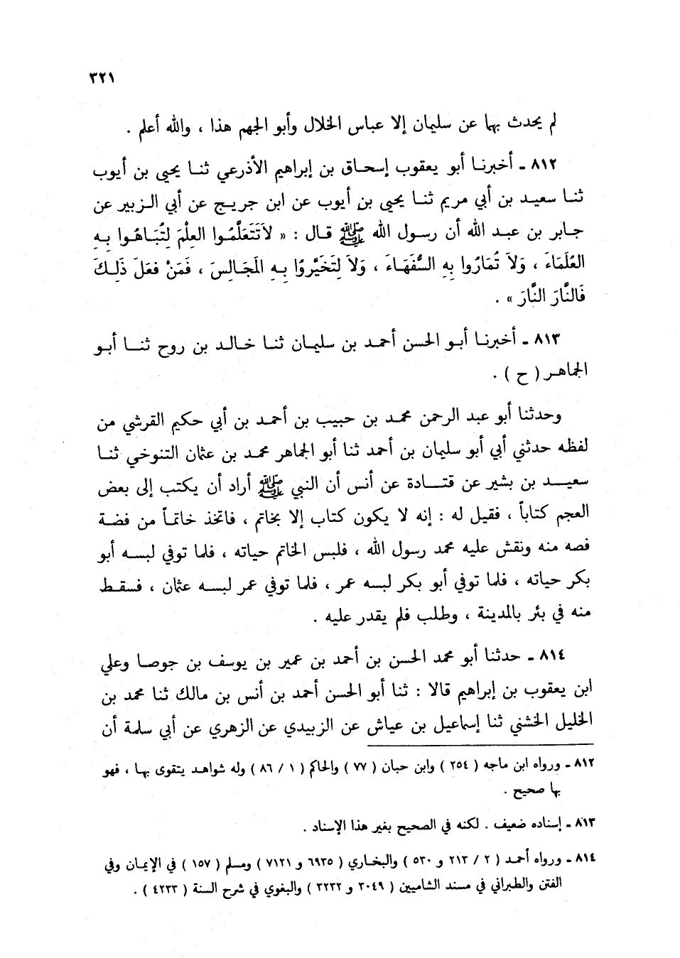 812 - أَخْبَرَنَا أَبُو يَعْقُوبَ إِسْحَاقُ بْنُ إِبْرَاهِيمَ الْأَذْرَعِيُّ، ثنا يَحْيَى بْنُ أَيُّوبَ، ثنا سَعِيدُ بْنُ أَبِي مَرْيَمَ، ثنا يَحْيَى بْنُ أَيُّوبَ، عَنِ ابْنِ جُرَيْجٍ، عَنْ أَبِي الزُّبَيْرِ، عَنْ جَابِرِ بْنِ عَبْدِ اللَّهِ، أَنَّ رَسُولَ اللَّهِ صَلَّى اللهُ عَلَيْهِ وَسَلَّمَ قَالَ: «§لَا تَتَعَلَّمُوا الْعِلْمَ لِتُبَاهُوا بِهِ الْعُلَمَاءَ، وَلَا تُمَارُوا بِهِ السُّفَهَاءَ، وَلَا لِتَخَيَّرُوا بِهِ الْمَجَالِسَ، فَمَنْ فَعَلَ ذَلِكَ فَالنَّارَ النَّارَ»