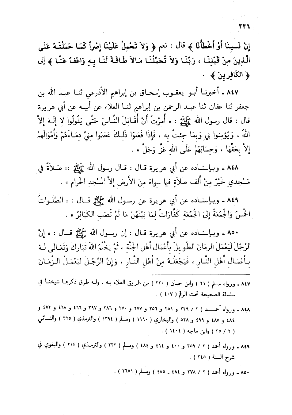 847 - أَخْبَرَنَا أَبُو يَعْقُوبَ إِسْحَاقُ بْنُ إِبْرَاهِيمَ الْأَذْرَعِيُّ، ثنا عَبْدُ اللَّهِ بْنُ جَعْفَرٍ، ثنا عَفَّانُ، ثنا عَبْدُ الرَّحْمَنِ بْنُ إِبْرَاهِيمَ، ثنا الْعَلَاءُ، عَنْ أَبِيهِ، عَنْ أَبِي هُرَيْرَةَ، قَالَ: قَالَ رَسُولُ اللَّهِ صَلَّى اللهُ عَلَيْهِ وَسَلَّمَ: §«أُمِرْتُ أَنْ أُقَاتِلَ النَّاسَ حَتَّى يَقُولُوا لَا إِلَهَ إِلَّا اللَّهُ، وَيُؤْمِنُوا بِي وَبِمَا جِئْتُ بِهِ، فَإِذَا فَعَلُوا ذَلِكَ عَصَمُوا مِنِّي دِمَائَهُمْ، وَأَمْوَالَهُمْ، إِلَّا بِحَقِّهَا وَحِسَابُهُمْ عَلَى اللَّهِ عَزَّ وَجَلَّ»