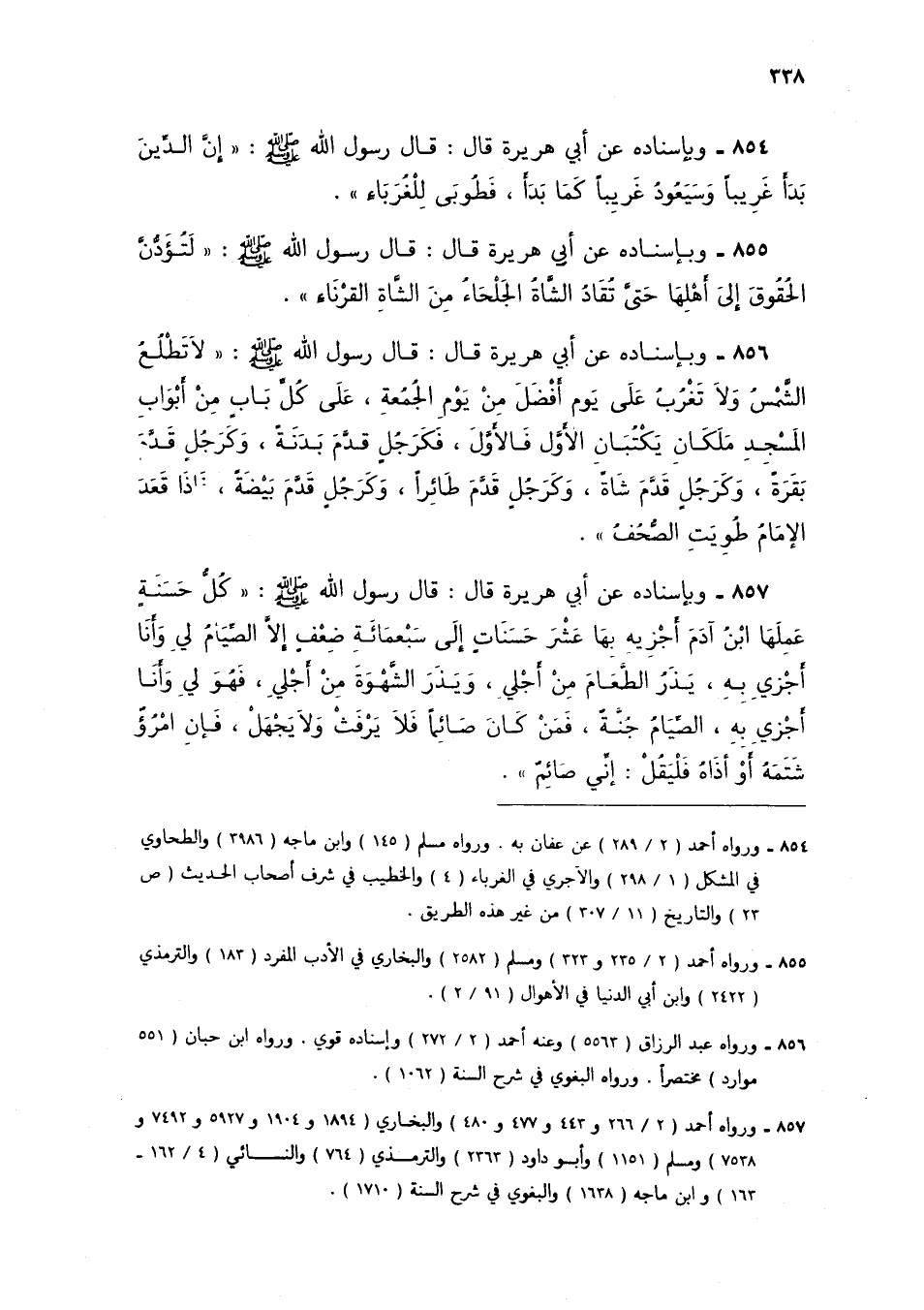 854 - وَبِإِسْنَادِهِ عَنْ أَبِي هُرَيْرَةَ، قَالَ: قَالَ رَسُولُ اللَّهِ صَلَّى اللهُ عَلَيْهِ وَسَلَّمَ: «إِنَّ §الدِّينَ بَدَأَ غَرِيبًا، وَسَيَعُودُ غَرِيبًا، كَمَا بَدَأَ فَطُوبَى لِلْغُرَبَاءِ»
