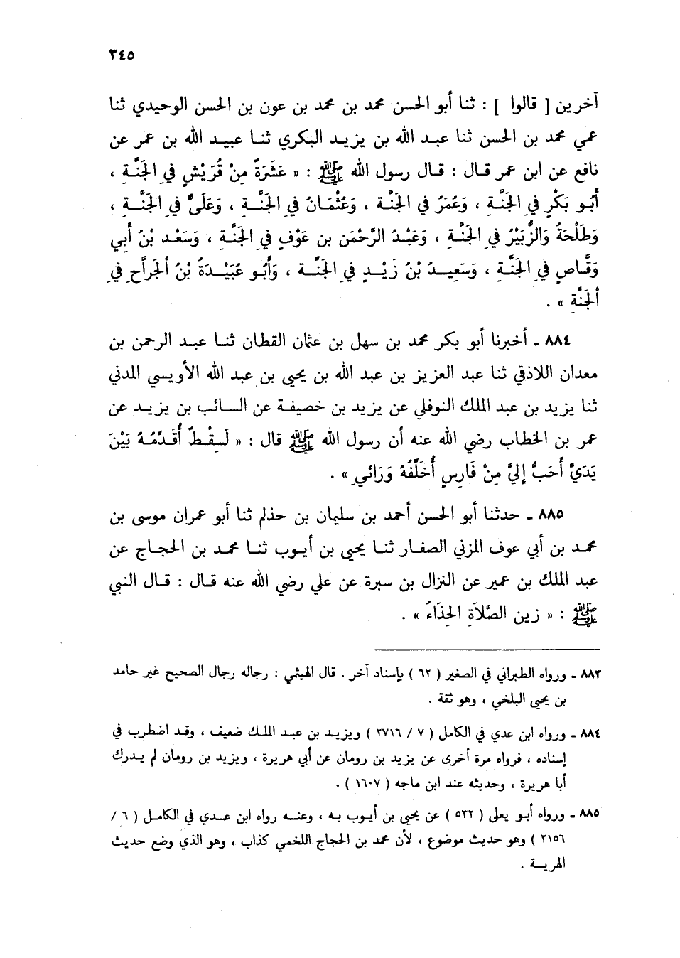 885 - حَدَّثَنَا أَبُو الْحَسَنِ أَحْمَدُ بْنُ سُلَيْمَانَ بْنِ حَذْلَمٍ، ثنا أَبُو عِمْرَانَ مُوسَى بْنُ مُحَمَّدِ بْنِ أَبِي عَوْفٍ الْمُزَنِيُّ الصَّفَّارُ، ثنا يَحْيَى بْنُ أَيُّوبَ، ثنا مُحَمَّدُ بْنُ الْحَجَّاجِ، عَنْ عَبْدِ الْمَلِكِ بْنِ عُمَيْرٍ، عَنِ النَّزَّالِ بْنِ سَبْرَةَ، عَنْ عَلِيٍّ رَضِيَ اللَّهُ عَنْهُ، قَالَ: قَالَ النَّبِيُّ صَلَّى اللهُ عَلَيْهِ وَسَلَّمَ: §«زَيْنُ الصَّلَاةِ الْحِذَاءُ»