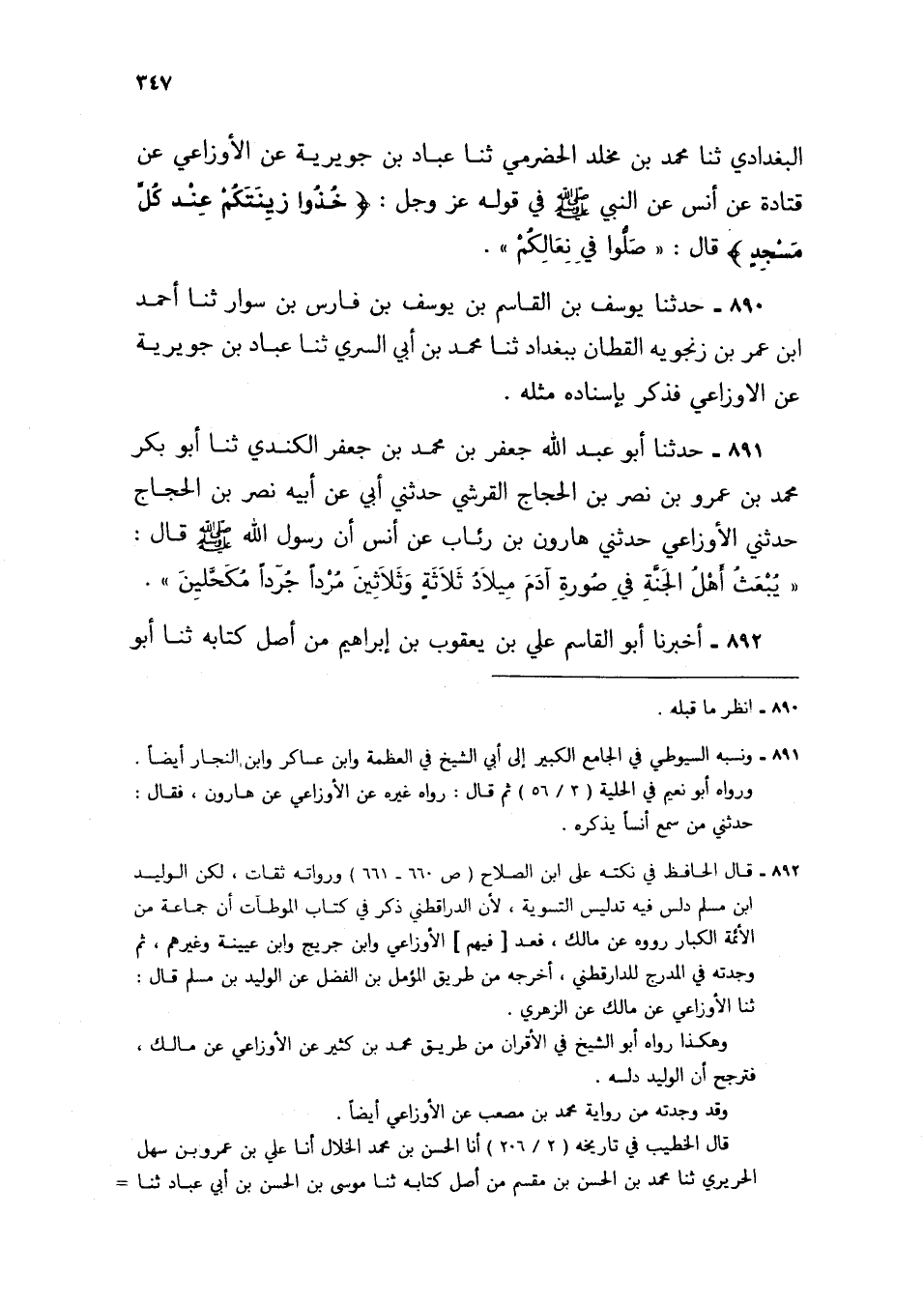 891 - حَدَّثَنَا أَبُو عَبْدِ اللَّهِ جَعْفَرُ بْنُ مُحَمَّدِ بْنِ جَعْفَرٍ الْكِنْدِيُّ، ثنا أَبُو بَكْرٍ مُحَمَّدُ بْنُ عَمْرِو بْنِ نَصْرِ بْنِ الْحَجَّاجِ الْقُرَشِيُّ، حَدَّثَنِي أَبِي، عَنْ أَبِيهِ نَصْرِ بْنِ الْحَجَّاجِ، حَدَّثَنِي الْأَوْزَاعِيُّ، حَدَّثَنِي هَارُونُ بْنُ رِئَابٍ، عَنْ أَنَسٍ، أَنَّ رَسُولَ اللَّهِ صَلَّى اللهُ عَلَيْهِ وَسَلَّمَ قَالَ: «§يُبْعَثُ أَهْلُ الْجَنَّةِ فِي صُورَةِ آدَمَ، مِيلَادُ ثَلَاثَةٍ وَثَلَاثِينَ مُرْدًا جُرْدًا مُكَحَّلِينَ»