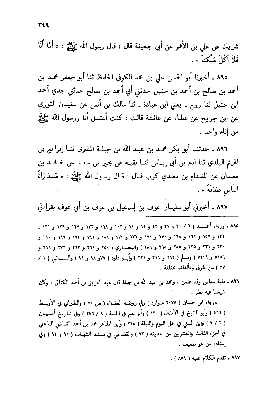 896 - حَدَّثَنَا أَبُو بَكْرٍ مُحَمَّدُ بْنُ عَبْدِ اللَّهِ بْنِ جَبَلَةَ الْمُضَرِيُّ، ثنا إِبْرَاهِيمُ بْنُ الْهَيْثَمِ الْبَلَدِيُّ، ثنا آدَمُ بْنُ أَبِي إِيَاسَ، ثنا بَقِيَّةُ، عَنْ بَحِيرِ بْنِ سَعْدٍ، عَنْ خَالِدِ بْنِ مَعْدَانَ، عَنِ الْمِقْدَامِ بْنِ مَعْدِي كَرِبَ، قَالَ: قَالَ رَسُولُ اللَّهِ صَلَّى اللهُ عَلَيْهِ وَسَلَّمَ: §«مُدَارَاةُ النَّاسِ صَدَقَةٌ»