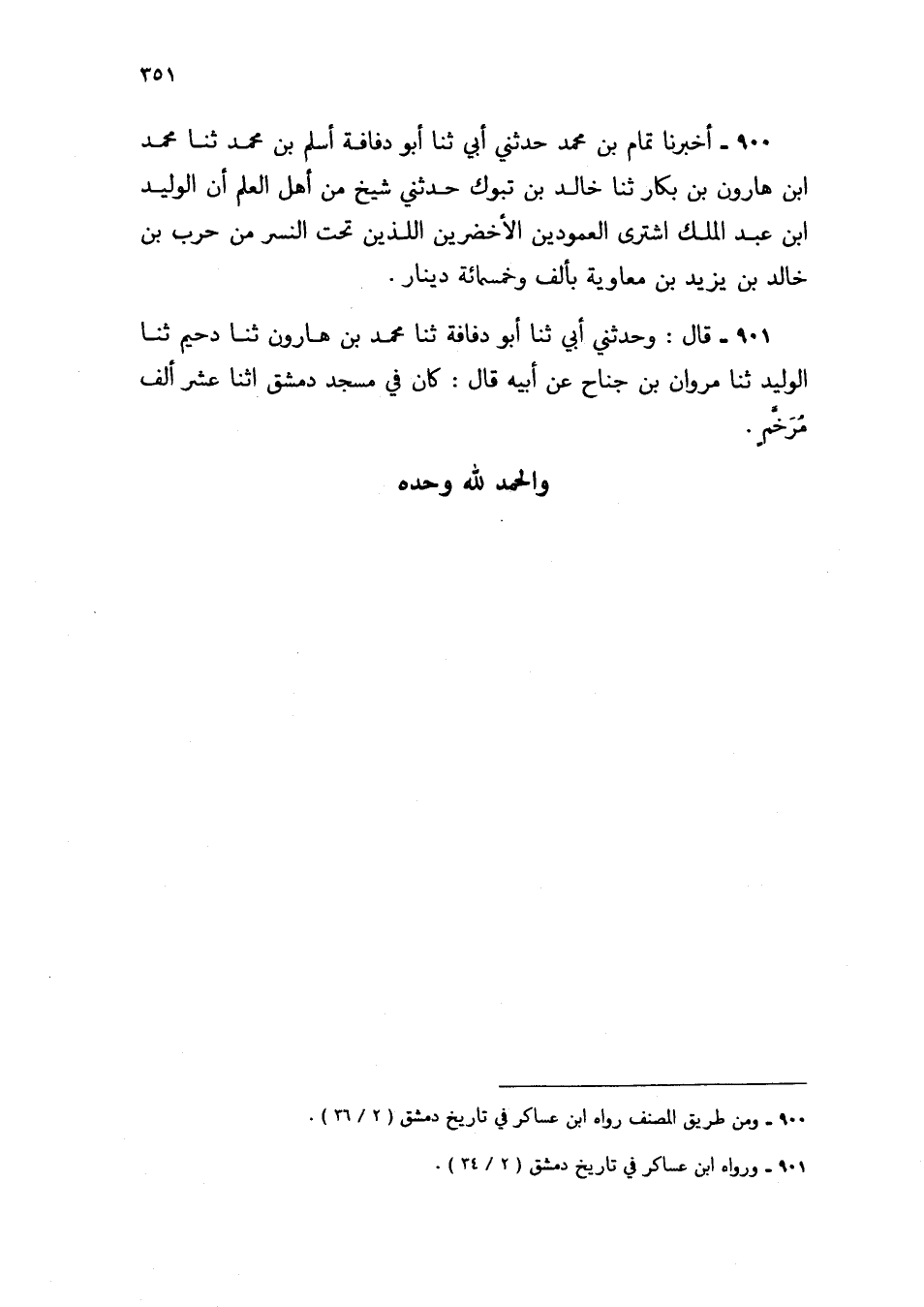 901 - قَالَ: وَحَدَّثَنِي أَبِي، ثنا أَبُو دُفَافَةَ، ثنا مُحَمَّدُ بْنُ هَارُونَ، ثنا دُحَيْمٌ، ثنا الْوَلِيدُ، ثنا مَرْوَانُ بْنُ جَنَاحٍ، عَنْ أَبِيهِ، قَالَ: «كَانَ §فِي مَسْجِدِ دِمَشْقَ اثْنَا عَشَرَ أَلْفَ مُرَخَّمٍ»
