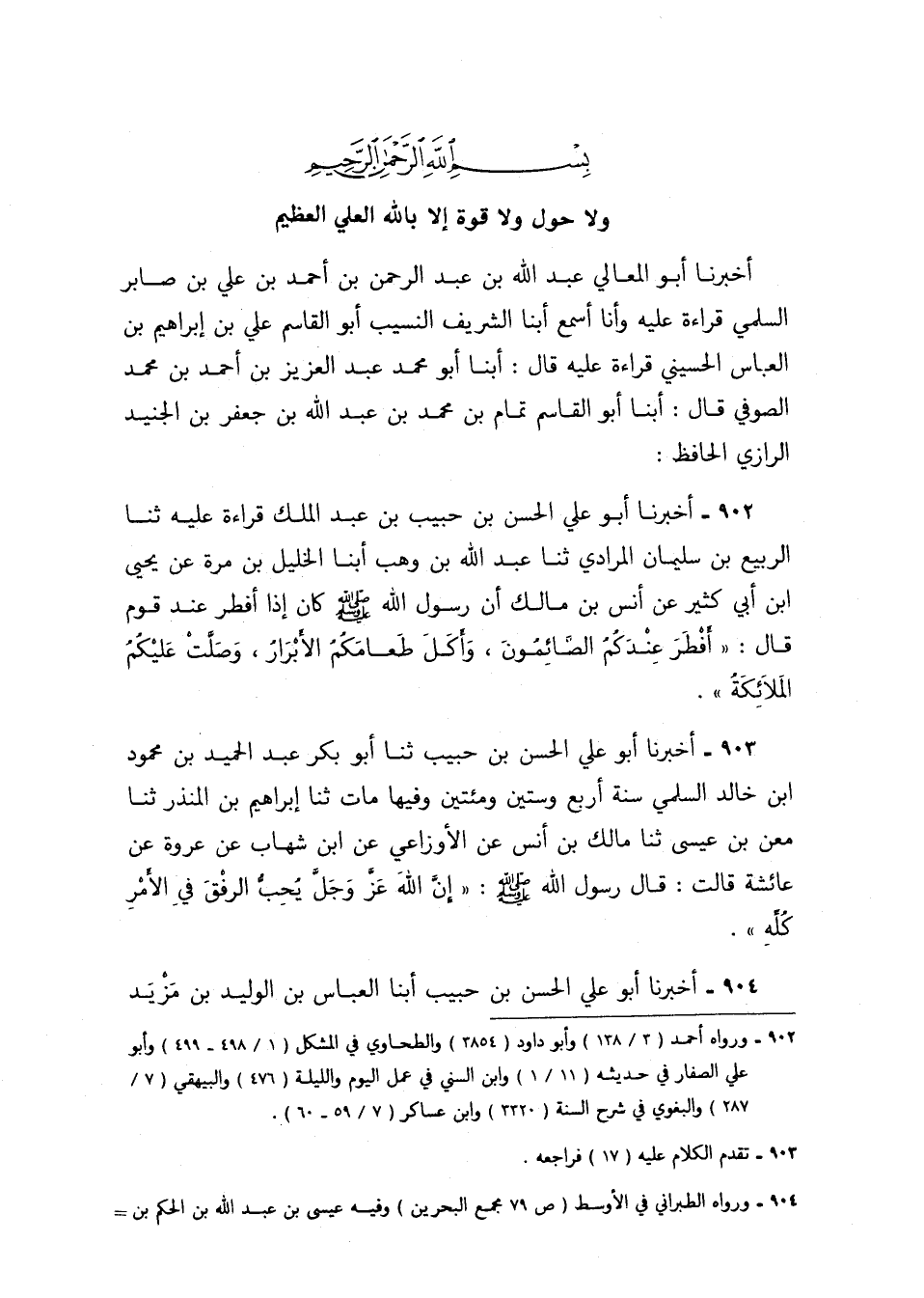 903 - أَخْبَرَنَا أَبُو عَلِيٍّ الْحَسَنُ بْنُ حَبِيبٍ، ثنا أَبُو بَكْرٍ عَبْدُ الْحَمِيدِ بْنُ مَحْمُودِ بْنِ خَالِدٍ السُّلَمِيُّ، سَنَةَ أَرْبَعٍ وَسِتِّينَ وَمِائَتَيْنِ وَفِيهَا مَاتَ، ثنا إِبْرَاهِيمُ بْنُ الْمُنْذِرِ، ثنا مَعْنُ بْنُ عِيسَى، ثنا مَالِكُ بْنُ أَنَسٍ، عَنِ الْأَوْزَاعِيِّ، عَنِ ابْنِ شِهَابٍ، عَنْ عُرْوَةَ، عَنْ عَائِشَةَ، قَالَتْ: قَالَ رَسُولُ اللَّهِ صَلَّى اللهُ عَلَيْهِ وَسَلَّمَ: «إِنَّ §اللَّهَ عَزَّ وَجَلَّ يُحِبُّ الرِّفْقَ فِي الْأَمْرِ كُلِّهِ»