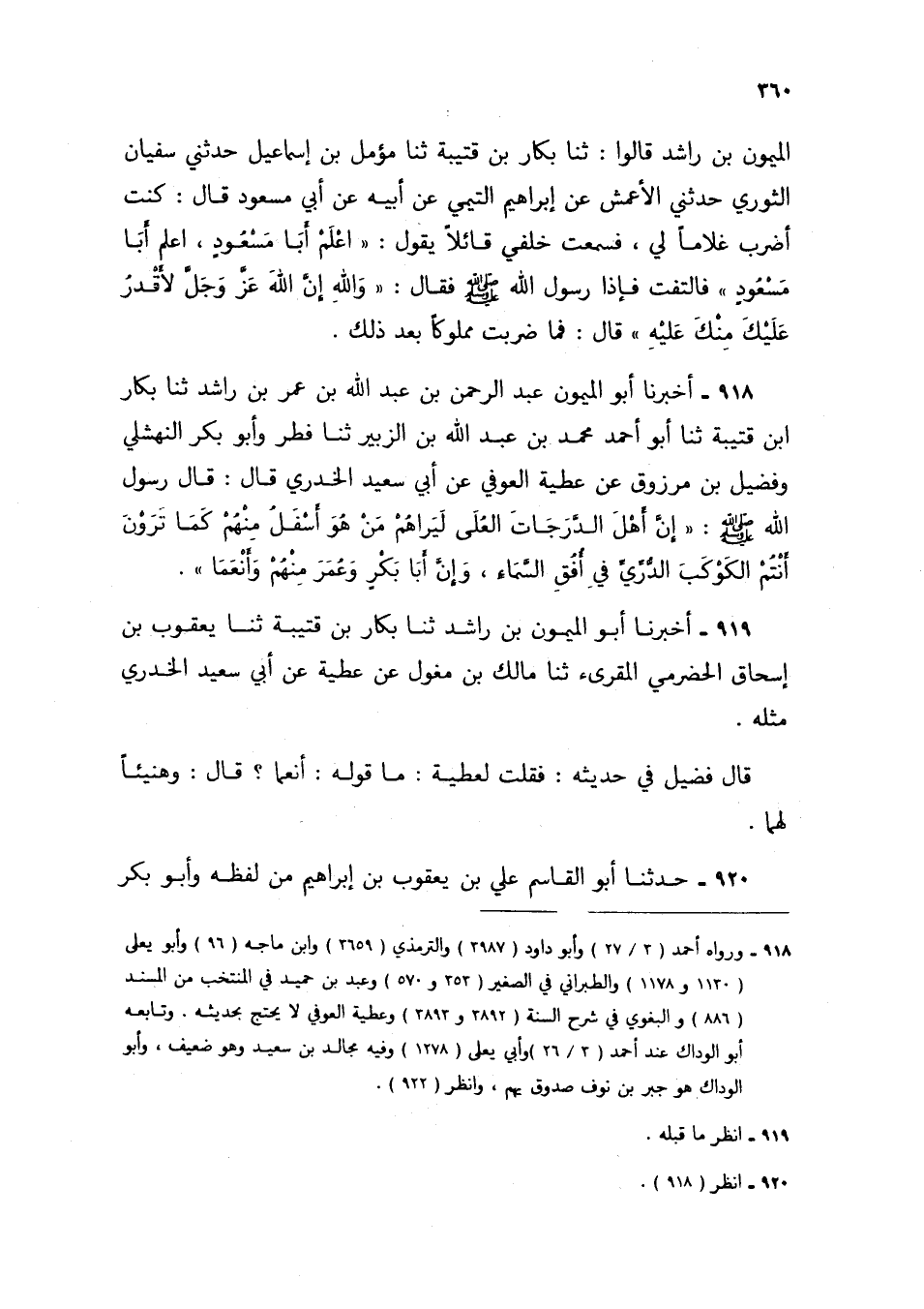 918 - أَخْبَرَنَا أَبُو الْمَيْمُونِ عَبْدُ الرَّحْمَنِ بْنُ عَبْدِ اللَّهِ بْنِ عُمَرَ بْنِ رَاشِدٍ، ثنا بَكَّارُ بْنُ قُتَيْبَةَ، ثنا أَبُو أَحْمَدَ مُحَمَّدُ بْنُ عَبْدِ اللَّهِ بْنِ الزُّبَيْرِ، ثنا فِطْرٌ، وَأَبُو بَكْرٍ النَّهْشَلِيُّ، وَفُضَيْلُ بْنُ مَرْزُوقٍ، عَنْ عَطِيَّةَ الْعَوْفِيِّ، عَنْ أَبِي سَعِيدٍ الْخُدْرِيِّ، قَالَ: قَالَ رَسُولُ اللَّهِ صَلَّى اللهُ عَلَيْهِ وَسَلَّمَ: «إِنَّ §أَهْلَ الدَّرَجَاتِ الْعُلَى لَيَرَاهُمْ مَنْ هُوَ أَسْفَلَ مِنْهُمْ كَمَا تَرَوْنَ أَنْتُمُ الْكَوْكَبَ الدُّرِّيَّ فِي أُفُقِ السَّمَاءِ، وَإِنَّ أَبَا بَكْرٍ وَعُمَرَ مِنْهُمْ وَأَنْعِمَا»