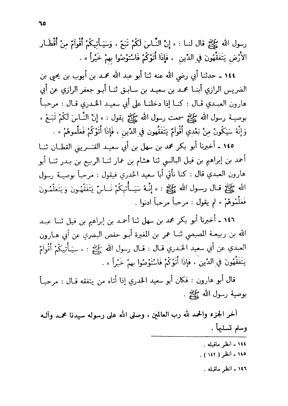 144 - حَدَّثَنَا أَبِي رَضِيَ اللَّهُ عَنْهُ، ثنا أَبُو عَبْدِ اللَّهِ مُحَمَّدُ بْنُ أَيُّوبَ بْنِ يَحْيَى بْنِ الضُّرَيْسِ الرَّازِيُّ، أبنا مُحَمَّدُ بْنُ سَعِيدِ بْنِ سَابِقٍ، ثنا أَبُو جَعْفَرٍ الرَّازِيُّ، عَنْ أَبِي هَارُونَ الْعَبْدِيِّ، قَالَ: كُنَّا إِذَا دَخَلْنَا عَلَى أَبِي سَعِيدٍ الْخُدْرِيِّ، قَالَ: مَرْحَبًا بِوَصِيَّةِ رَسُولِ اللَّهِ صَلَّى اللهُ عَلَيْهِ وَسَلَّمَ، سَمِعْتُ رَسُولَ اللَّهِ صَلَّى اللهُ عَلَيْهِ وَسَلَّمَ يَقُولُ: «إِنَّ §النَّاسَ لَكُمْ تَبَعٌ، وَإِنَّهُ سَيَكُونُ مِنْ بَعْدِي أَقْوَامٌ يَتَفَقَّهُونَ فِي الدِّينِ، فَإِذَا أَتَوْكُمْ فَعَلِّمُوهُمْ»