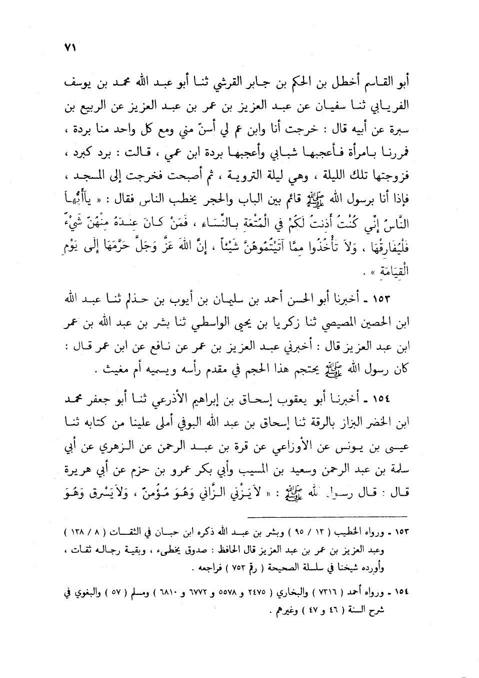 154 - أَخْبَرَنَا أَبُو يَعْقُوبَ إِسْحَاقُ بْنُ إِبْرَاهِيمَ الْأَذْرَعِيُّ، ثنا أَبُو جَعْفَرٍ مُحَمَّدُ بْنُ الْخَضِرِ الْبَزَّازُ بِالرَّقَّةِ، ثنا إِسْحَاقُ بْنُ عَبْدِ اللَّهِ الْبُوفِيُّ، أَمْلَى عَلَيْنَا مِنْ كِتَابِهِ، ثنا عِيسَى بْنُ يُونُسَ، عَنِ الْأَوْزَاعِيِّ، عَنْ قُرَّةَ بْنِ عَبْدِ الرَّحْمَنِ، عَنِ الزُّهْرِيِّ، عَنْ أَبِي سَلَمَةَ بْنِ عَبْدِ الرَّحْمَنِ، وَسَعِيدِ بْنِ الْمُسَيِّبِ، وَأَبِي بَكْرٍ عَمْرِو بْنِ حَزْمٍ، عَنْ أَبِي هُرَيْرَةَ، قَالَ: قَالَ رَسُولُ اللَّهِ صَلَّى اللهُ عَلَيْهِ وَسَلَّمَ: «§لَا يَزْنِي الزَّانِي وَهُوَ مُؤْمِنٌ، وَلَا يَسْرِقُ وَهُوَ -[72]- مُؤْمِنٌ، وَلَا يَشْرَبُ الْخَمْرَ وَهُوَ مُؤْمِنٌ، فَإِذَا فَعَلَ مِنْ ذَلِكَ شَيْئًا نُزِعَ الْإِيمَانُ مِنْ قَلْبِهِ، فَإِنْ تَابَ رُدَّ إِلَيْهِ»