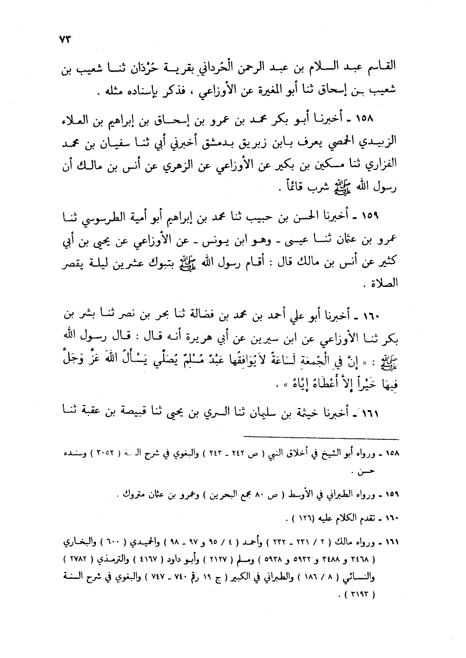 160 - أَخْبَرَنَا أَبُو عَلِيٍّ أَحْمَدُ بْنُ مُحَمَّدِ بْنِ فَضَالَةَ، ثنا بَحْرُ بْنُ نَصْرٍ، ثنا بِشْرُ بْنُ بَكْرٍ، ثنا الْأَوْزَاعِيُّ، عَنِ ابْنِ سِيرِينَ، عَنْ أَبِي هُرَيْرَةَ، أَنَّهُ قَالَ: قَالَ رَسُولُ اللَّهِ صَلَّى اللهُ عَلَيْهِ وَسَلَّمَ: «إِنَّ §فِي الْجُمُعَةِ لَسَاعَةً لَا يُوَافِقُهَا عَبْدٌ مُسْلِمٌ يُصَلِّي يَسْأَلُ اللَّهَ عَزَّ وَجَلَّ فِيهَا خَيْرًا، إِلَّا أَعْطَاهُ إِيَّاهُ»
