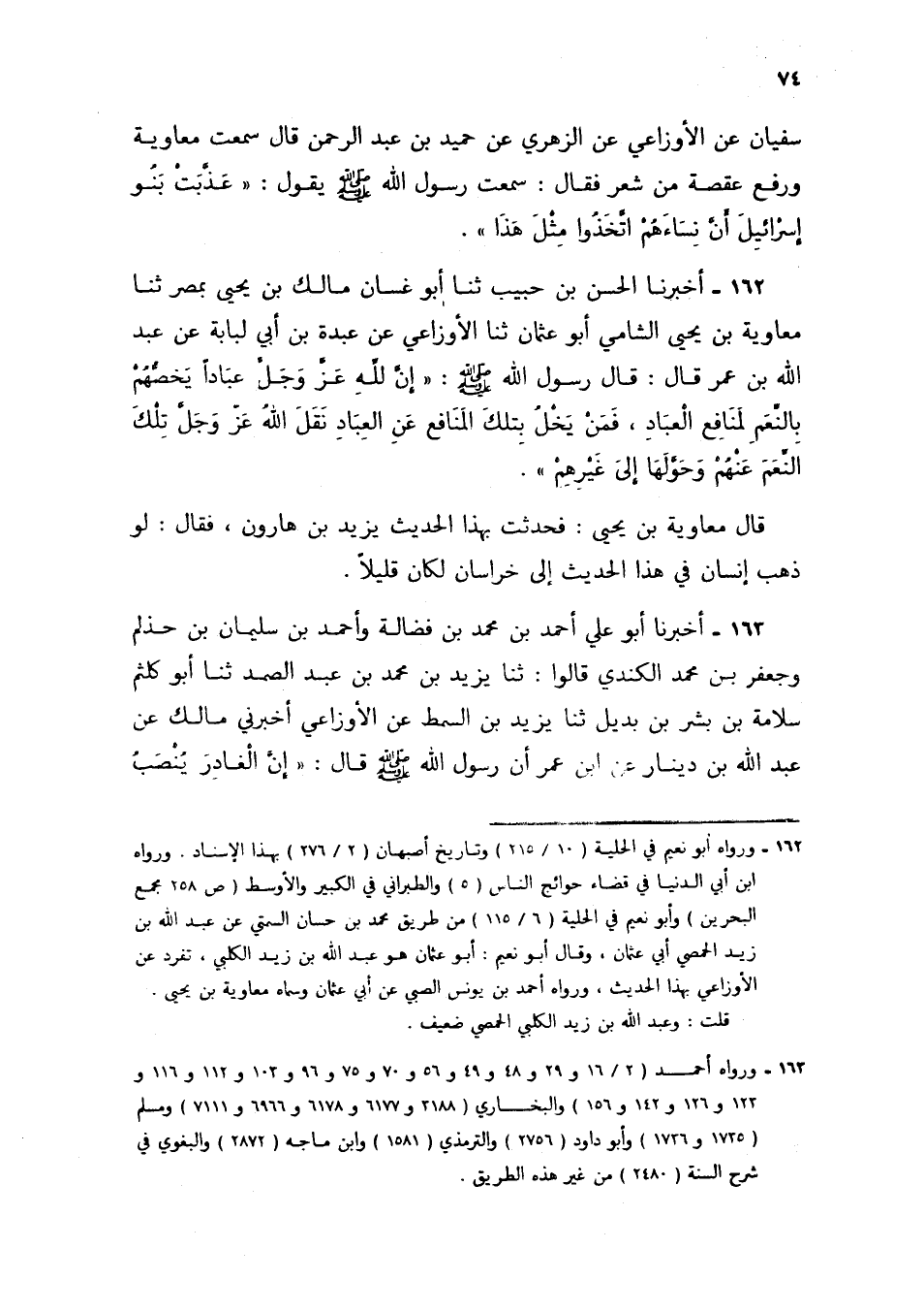 162 - أَخْبَرَنَا الْحَسَنُ بْنُ حَبِيبٍ، ثنا أَبُو غَسَّانَ مَالِكُ بْنُ يَحْيَى بِمِصْرَ، ثنا مُعَاوِيَةُ بْنُ يَحْيَى الشَّامِيُّ أَبُو عُثْمَانَ، ثنا الْأَوْزَاعِيُّ، عَنْ عَبْدَةَ بْنِ أَبِي لُبَابَةَ، عَنْ عَبْدِ اللَّهِ بْنِ عُمَرَ، قَالَ: قَالَ رَسُولُ اللَّهِ صَلَّى اللهُ عَلَيْهِ وَسَلَّمَ: «إِنَّ §لِلَّهِ عَزَّ وَجَلَّ عِبَادًا يَخُصُّهُمْ بِالنِّعَمِ لِمَنَافِعِ الْعِبَادِ، فَمَنْ يَخْلُ بِتِلْكَ الْمَنَافِعِ عَنِ الْعِبَادِ نَقَلَ اللَّهُ عَزَّ وَجَلَّ تِلْكَ النِّعَمَ عَنْهُمْ وَحَوَّلَهَا إِلَى غَيْرِهِمْ» قَالَ مُعَاوِيَةُ بْنُ يَحْيَى: فَحَدَّثْتُ بِهَذَا الْحَدِيثِ يَزِيدَ بْنِ هَارُونَ، فَقَالَ: «لَوْ ذَهَبَ إِنْسَانٌ فِي هَذَا الْحَدِيثِ إِلَى خُرَاسَانَ لَكَانَ قَلِيلًا»