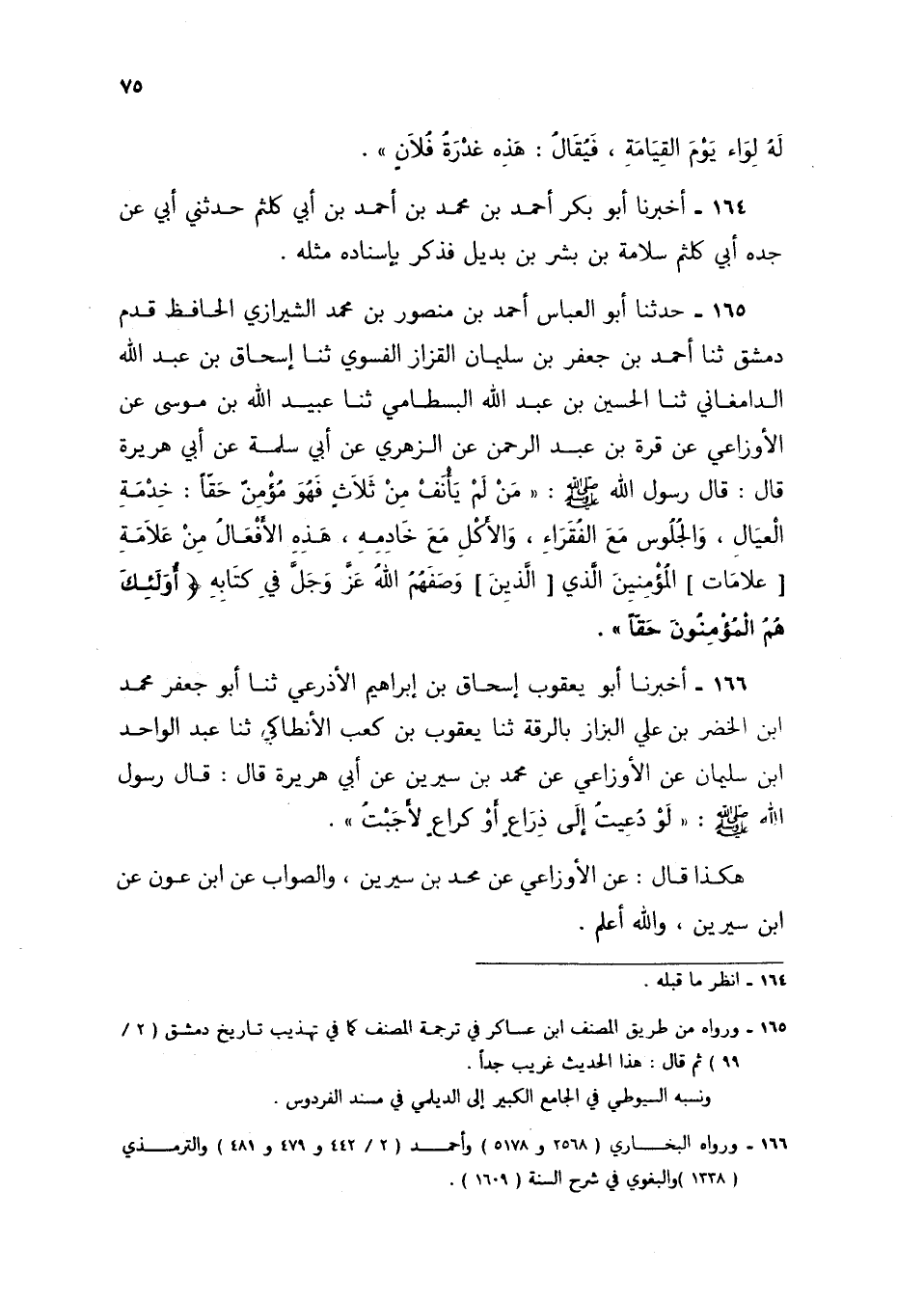 165 - حَدَّثَنَا أَبُو الْعَبَّاسِ أَحْمَدُ بْنُ مَنْصُورِ بْنِ مُحَمَّدٍ الشِّيرَازِيُّ الْحَافِظُ قَدِمَ دِمَشْقَ، ثنا أَحْمَدُ بْنُ جَعْفَرِ بْنِ سُلَيْمَانَ الْقَزَّازُ الْفَسَوِيُّ، ثنا إِسْحَاقُ بْنُ عَبْدِ اللَّهِ الدَّامِغَانِيُّ، ثنا الْحُسَيْنُ بْنُ عَبْدِ اللَّهِ الْبِسْطَامِيُّ، ثنا عُبَيْدُ اللَّهِ بْنُ مُوسَى، عَنِ الْأَوْزَاعِيِّ، عَنْ قُرَّةَ بْنِ عَبْدِ الرَّحْمَنِ، عَنِ الزُّهْرِيِّ، عَنْ أَبِي سَلَمَةَ، عَنْ أَبِي هُرَيْرَةَ، قَالَ: قَالَ رَسُولُ اللَّهِ صَلَّى اللهُ عَلَيْهِ وَسَلَّمَ: " §مَنْ لَمْ يَأْنَفْ مِنْ ثَلَاثٍ فَهُوَ مُؤْمِنٌ حَقًّا: خِدْمَةِ الْعِيَالِ، وَالْجُلُوسِ مَعَ الْفُقَرَاءِ، وَالْأَكْلِ مَعَ خَادِمِهِ، هَذِهِ الْأَفْعَالُ مِنْ عَلَامَاتِ الْمُؤْمِنِينَ الَّذِينَ وَصَفَهُمُ اللَّهُ عَزَّ وَجَلَّ فِي كِتَابِهِ {أُولَئِكَ هُمُ الْمُؤْمِنُونَ حَقًّا} [الأنفال: 4] "