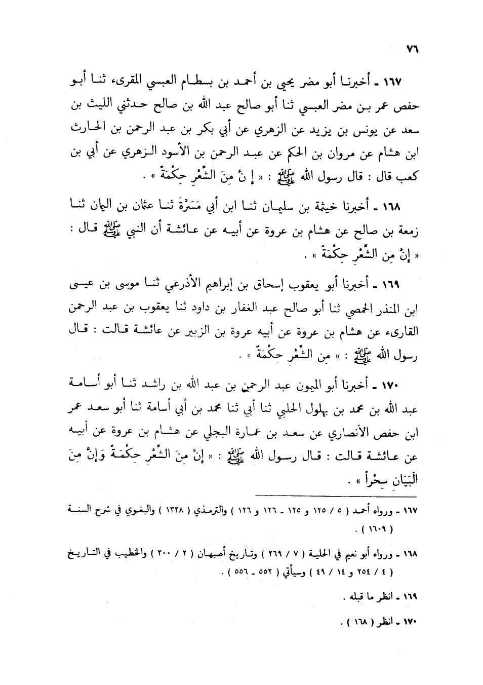 169 - أَخْبَرَنَا أَبُو يَعْقُوبَ إِسْحَاقُ بْنُ إِبْرَاهِيمَ الْأَذْرَعِيُّ، ثنا مُوسَى بْنُ عِيسَى بْنِ الْمُنْذِرِ الْحِمْصِيُّ، ثنا أَبُو صَالِحٍ عَبْدُ الْغَفَّارِ بْنُ دَاوُدَ، ثنا يَعْقُوبُ بْنُ عَبْدِ الرَّحْمَنِ الْقَارِئُ، عَنْ هِشَامِ بْنِ عُرْوَةَ، عَنْ أَبِيهِ عُرْوَةَ بْنِ الزُّبَيْرِ، عَنْ عَائِشَةَ، قَالَتْ: قَالَ رَسُولُ اللَّهِ صَلَّى اللهُ عَلَيْهِ وَسَلَّمَ: §«مِنَ الشِّعْرِ حِكْمَةٌ»