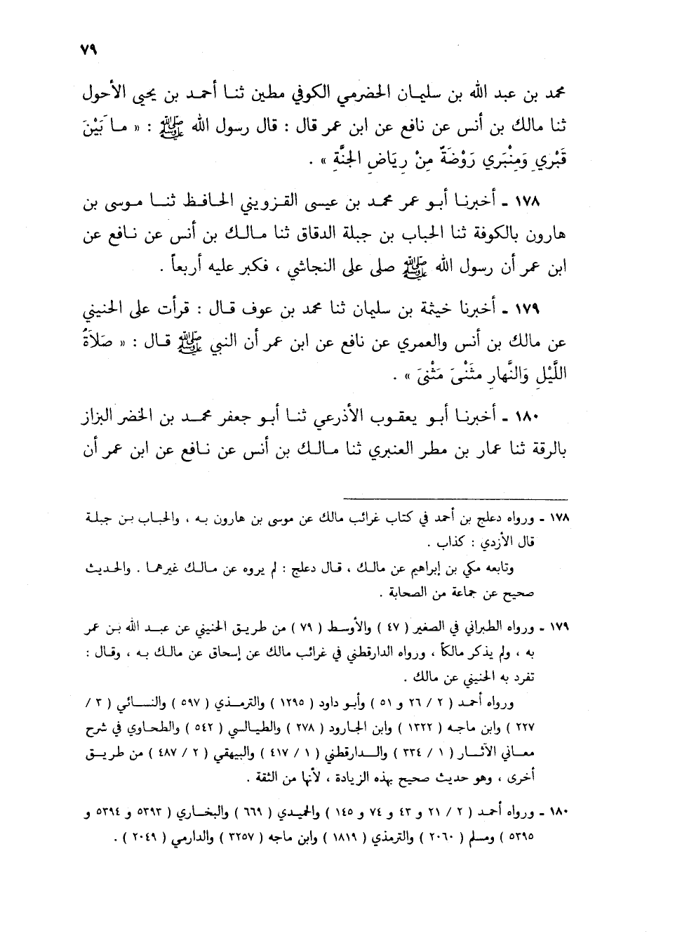 179 - أَخْبَرَنَا خَيْثَمَةُ بْنُ سُلَيْمَانَ، ثنا مُحَمَّدُ بْنُ عَوْفٍ، قَالَ: قَرَأْتُ عَلَى الْحُنَيْنِيِّ، عَنْ مَالِكِ بْنِ أَنَسٍ، وَالْعُمَرِيِّ، عَنْ نَافِعٍ، عَنِ ابْنِ عُمَرَ، أَنَّ النَّبِيَّ صَلَّى اللهُ عَلَيْهِ وَسَلَّمَ قَالَ: §«صَلَاةُ اللَّيْلِ وَالنَّهَارِ مَثْنَى مَثْنَى»