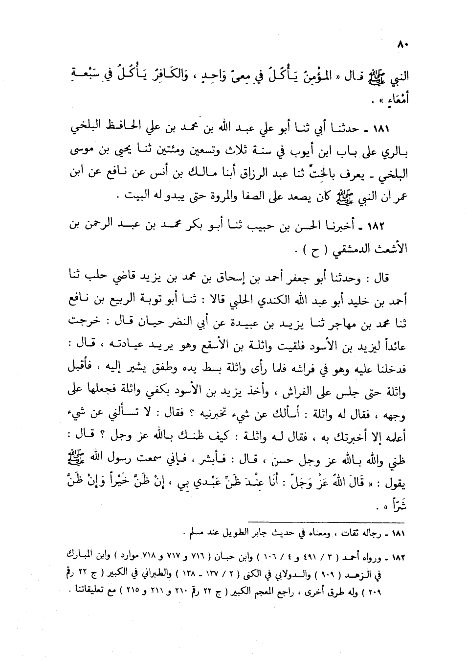 182 - أَخْبَرَنَا الْحَسَنُ بْنُ حَبِيبٍ، ثنا أَبُو بَكْرٍ مُحَمَّدُ بْنُ عَبْدِ الرَّحْمَنِ بْنِ الْأَشْعَثِ الدِّمَشْقِيُّ، ح، قَالَ: وَحَدَّثَنَا أَبُو جَعْفَرٍ أَحْمَدُ بْنُ إِسْحَاقَ بْنِ مُحَمَّدِ بْنِ يَزِيدَ قَاضِي حَلَبَ، ثنا أَحْمَدُ بْنُ خُلَيْدٍ أَبُو عَبْدِ اللَّهِ الْكِنْدِيُّ الْحَلَبِيُّ، قَالَا: ثنا أَبُو تَوْبَةَ الرَّبِيعُ بْنُ نَافِعٍ، ثنا مُحَمَّدُ بْنُ مُهَاجِرٍ، ثنا يَزِيدُ بْنُ عُبَيْدَةَ، عَنْ أَبِي النَّضْرِ حَيَّانَ، قَالَ: خَرَجْتُ عَائِدًا لِيَزِيدَ بْنِ الْأَسْوَدِ فَلَقِيتُ وَاثِلَةَ بْنَ الْأَسْقَعِ وَهُوَ يُرِيدُ عِيَادَتَهُ قَالَ: فَدَخَلْنَا عَلَيْهِ وَهُوَ فِي فِرَاشِهِ، فَلَمَّا رَأَى وَاثِلَةَ بَسَطَ يَدَهُ وَطَفِقَ يُشِيرُ إِلَيْهِ فَأَقْبَلَ وَاثِلَةُ حَتَّى جَلَسَ عَلَى الْفِرَاشِ، وَأَخَذَ يَزِيدُ بْنُ الْأَسْوَدِ بِكَفَّيْ وَاثِلَةَ فَجَعَلَهَا عَلَى وَجْهِهِ فَقَالَ لَهُ وَاثِلَةُ: أَسْأَلُكَ عَنْ شَيْءٍ تُخْبِرْنِيهِ؟ فَقَالَ: لَا تَسْأَلُنِي عَنْ شَيْءٍ أَعْلَمُهُ إِلَّا أَخْبَرْتُكَ بِهِ، فَقَالَ لَهُ وَاثِلَةُ: كَيْفَ ظَنُّكَ بِاللَّهِ عَزَّ وَجَلَّ؟ قَالَ: ظَنِّي وَاللَّهِ بِاللَّهِ عَزَّ وَجَلَّ حَسَنٌ، قَالَ: فَأَبْشِرْ فَإِنِّي سَمِعْتُ رَسُولَ اللَّهِ صَلَّى اللهُ عَلَيْهِ وَسَلَّمَ يَقُولُ: " قَالَ اللَّهُ عَزَّ وَجَلَّ: §أَنَا عِنْدَ ظَنِّ عَبْدِي بِي، إِنْ ظَنَّ خَيْرًا وَإِنْ ظَنَّ شَرًّا " -[81]- لَفْظُ ابْنِ حَبِيبٍ