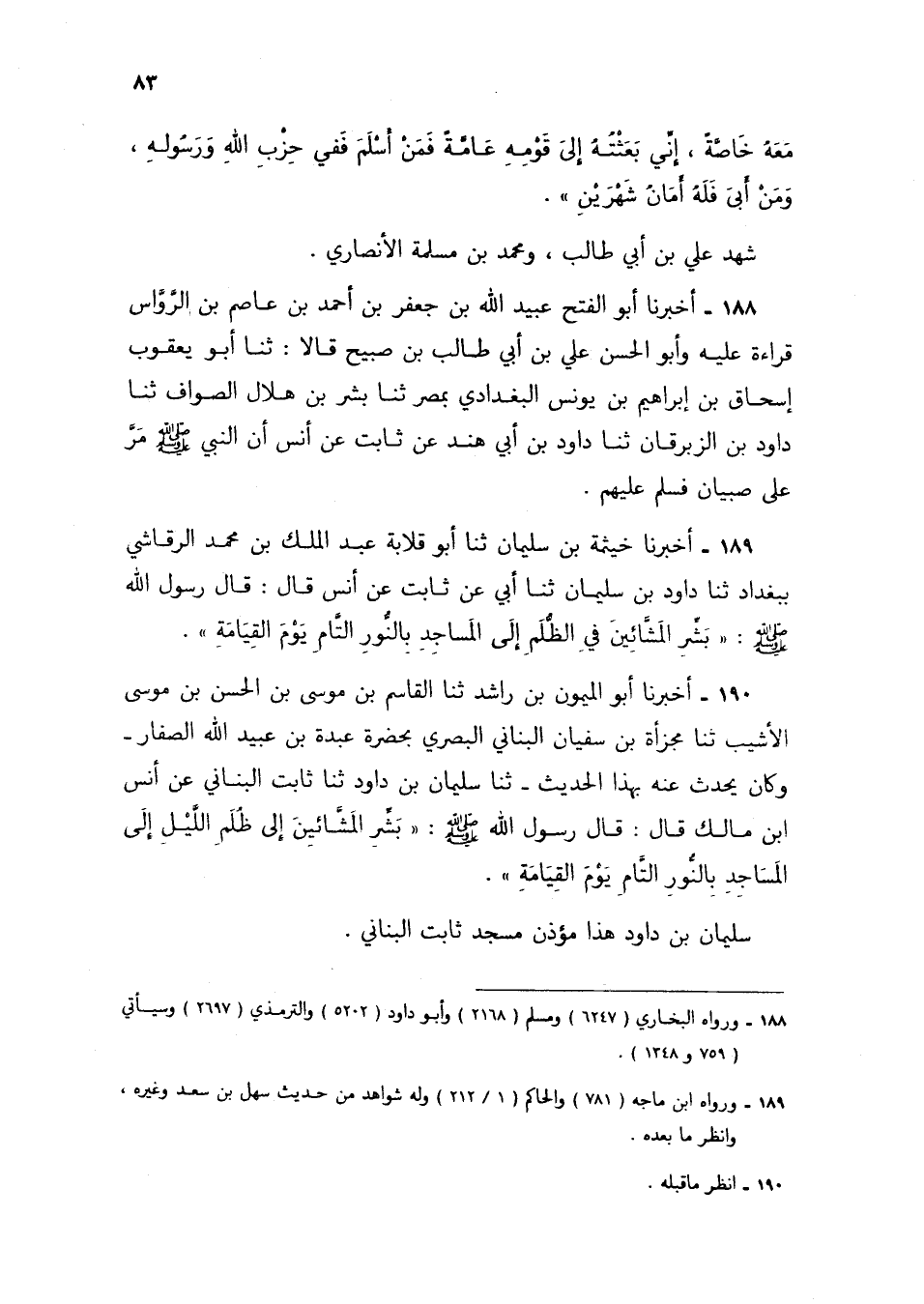189 - أَخْبَرَنَا خَيْثَمَةُ بْنُ سُلَيْمَانَ، ثنا أَبُو قِلَابَةَ عَبْدُ الْمَلِكِ بْنُ مُحَمَّدٍ الرَّقَاشِيُّ، بِبَغْدَادَ، ثنا دَاوُدُ بْنُ سُلَيْمَانَ، ثنا أَبِي، عَنْ ثَابِتٍ، عَنْ أَنَسٍ، قَالَ: قَالَ رَسُولُ اللَّهِ صَلَّى اللهُ عَلَيْهِ وَسَلَّمَ: «§بَشِّرِ الْمَشَّائِينَ فِي الظُّلَمِ إِلَى الْمَسَاجِدِ، بِالنُّورِ التَّامِّ يَوْمَ الْقِيَامَةِ»