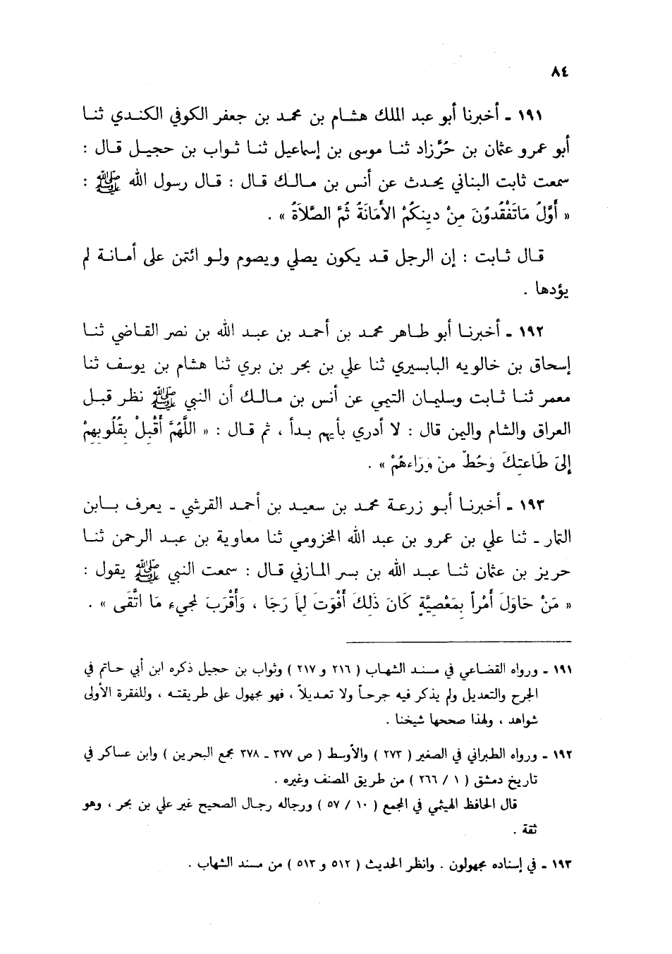 191 - أَخْبَرَنَا أَبُو عَبْدِ الْمَلِكِ هِشَامُ بْنُ مُحَمَّدِ بْنِ جَعْفَرٍ الْكُوفِيُّ الْكِنْدِيُّ، ثنا أَبُو عَمْرٍو عُثْمَانُ خُرَّزَاذَ، ثنا مُوسَى بْنُ إِسْمَاعِيلَ، ثنا تَوَّابُ بْنُ حُجَيْلٍ، قَالَ: سَمِعْتُ ثَابِتًا الْبُنَانِيَّ، يُحَدِّثُ عَنْ أَنَسِ بْنِ مَالِكٍ، قَالَ: قَالَ رَسُولُ اللَّهِ صَلَّى اللهُ عَلَيْهِ وَسَلَّمَ: «§أَوَّلُ مَا تَفْقِدُونَ مِنْ دِينِكُمُ الْأَمَانَةُ، ثُمَّ الصَّلَاةُ» قَالَ ثَابِتٌ: إِنَّ الرَّجُلَ قَدْ يَكُونُ يُصَلِّي وَيَصُومُ، وَلَوِ ائْتُمِنَ عَلَى أَمَانَةٍ لَمْ يُؤَدِّهَا