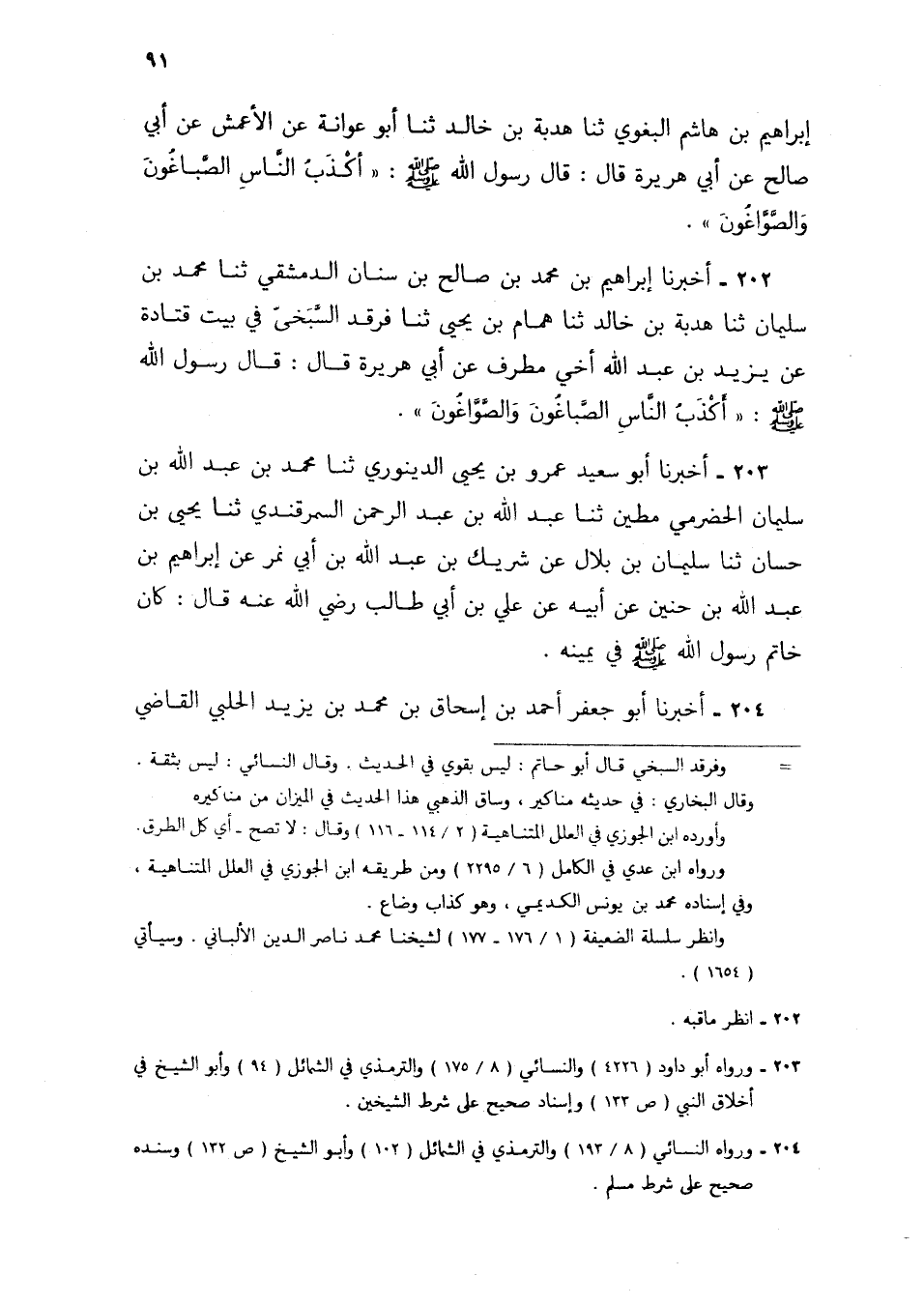 202 - أَخْبَرَنَا إِبْرَاهِيمُ بْنُ مُحَمَّدِ بْنِ صَالِحِ بْنِ سِنَانٍ الدِّمَشْقِيُّ، ثنا مُحَمَّدُ بْنُ سُلَيْمَانَ، ثنا هُدْبَةُ بْنُ خَالِدٍ، ثنا هَمَّامُ بْنُ يَحْيَى، ثنا فَرْقَدٌ السَّبَخِيُّ، فِي بَيْتِ قَتَادَةَ، عَنْ يَزِيدَ بْنِ عَبْدِ اللَّهِ، أَخِي مُطَرِّفٍ، عَنْ أَبِي هُرَيْرَةَ، قَالَ: قَالَ رَسُولُ اللَّهِ صَلَّى اللهُ عَلَيْهِ وَسَلَّمَ: «§أَكْذَبُ النَّاسِ الصَّبَّاغُونَ، وَالصَّوَّاغُونَ»