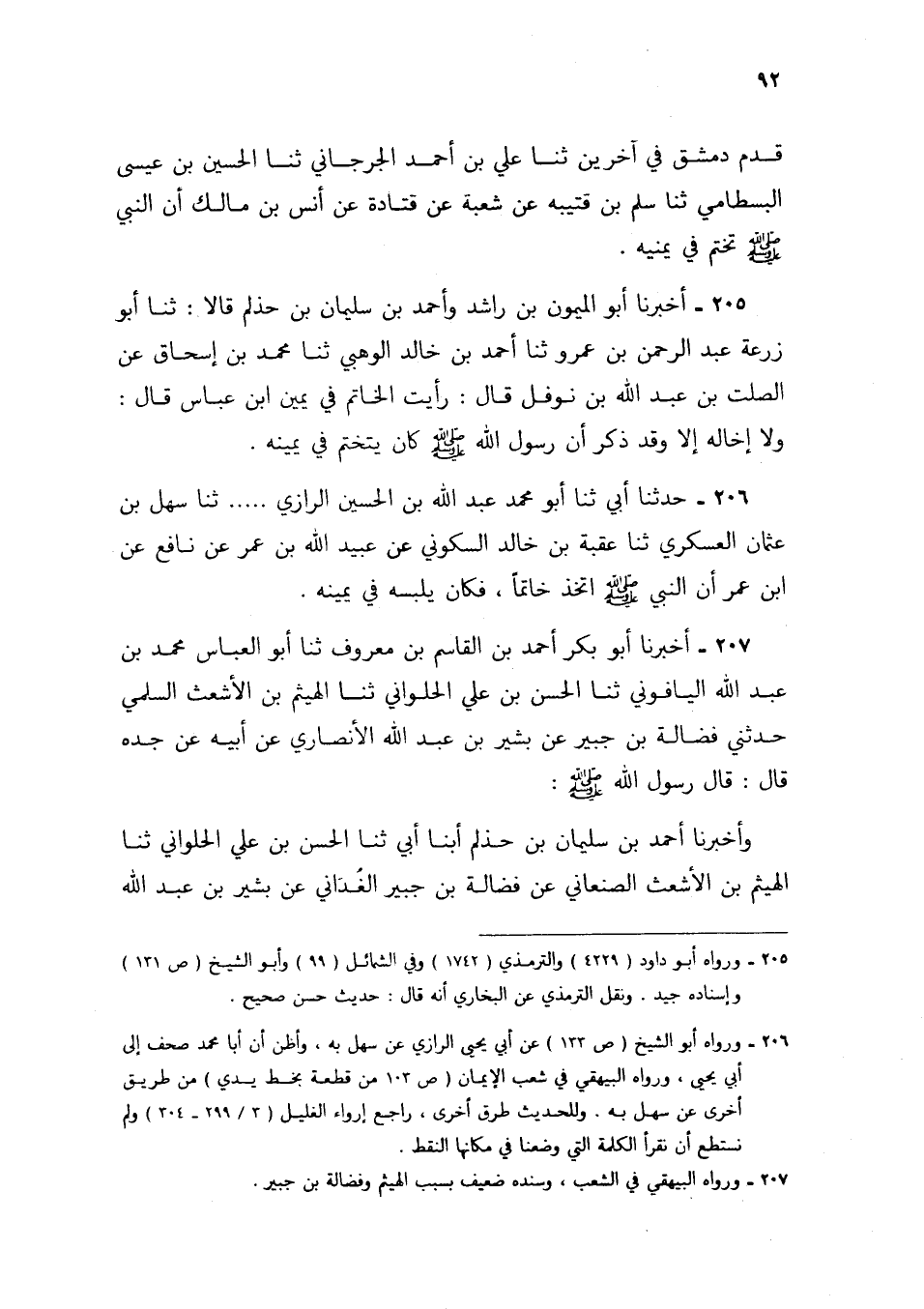 205 - أَخْبَرَنَا أَبُو الْمَيْمُونِ بْنُ رَاشِدٍ، وَأَحْمَدُ بْنُ سُلَيْمَانَ بْنِ حَذْلَمٍ، قَالَا: ثنا أَبُو زُرْعَةَ عَبْدُ الرَّحْمَنِ بْنُ عَمْرٍو، ثنا أَحْمَدُ بْنُ خَالِدٍ الْوَهْبِيُّ، ثنا مُحَمَّدُ بْنُ إِسْحَاقَ، عَنِ الصَّلْتِ بْنِ عَبْدِ اللَّهِ بْنِ نَوْفَلٍ، قَالَ: رَأَيْتُ الْخَاتَمَ فِي يَمِينِ ابْنِ عَبَّاسٍ قَالَ: وَلَا إِخَالُهُ إِلَّا وَقَدْ ذَكَرَ «أَنَّ رَسُولَ اللَّهِ صَلَّى اللهُ عَلَيْهِ وَسَلَّمَ كَانَ §يَتَخَتَّمُ فِي يَمِينِهِ»