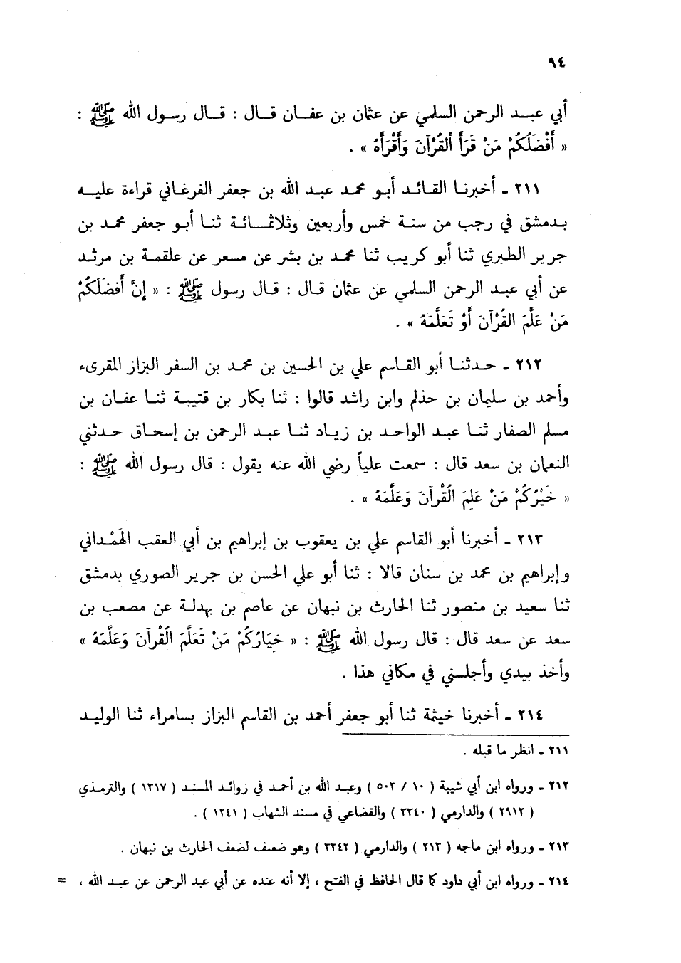 211 - أَخْبَرَنَا الْقَائِدُ أَبُو مُحَمَّدٍ عَبْدُ اللَّهِ بْنُ جَعْفَرٍ الْفَرْغَانِيُّ، قِرَاءَةً عَلَيْهِ بِدِمَشْقَ فِي رَجَبٍ مِنْ سَنَةِ خَمْسٍ وَأَرْبَعِينَ وَثَلَاثِمِائَةٍ، ثنا أَبُو جَعْفَرٍ مُحَمَّدُ بْنُ جَرِيرٍ الطَّبَرِيُّ، ثنا أَبُو كُرَيْبٍ، ثنا مُحَمَّدُ بْنُ بِشْرٍ، عَنْ مِسْعَرٍ، عَنْ عَلْقَمَةَ بْنِ مَرْثَدٍ، عَنْ أَبِي عَبْدِ الرَّحْمَنِ السُّلَمِيِّ، عَنْ عُثْمَانَ، قَالَ: قَالَ رَسُولُ اللَّهِ صَلَّى اللهُ عَلَيْهِ وَسَلَّمَ: «إِنَّ §أَفْضَلَكُمْ مَنْ عَلَّمَ الْقُرْآنَ أَوْ تَعَلَّمَهُ»