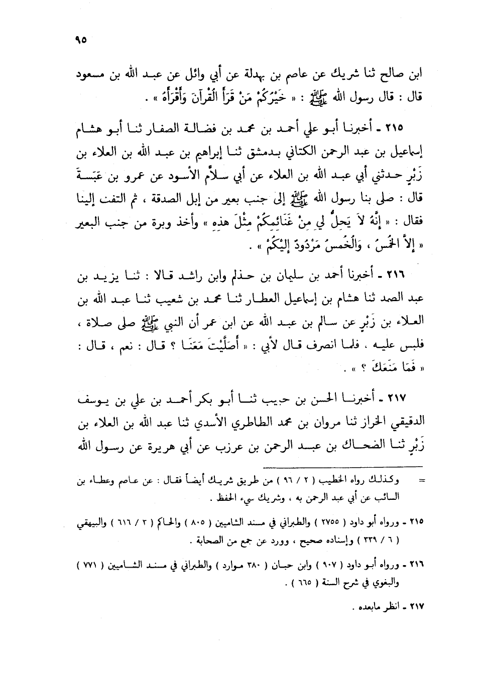 215 - أَخْبَرَنَا أَبُو عَلِيٍّ أَحْمَدُ بْنُ مُحَمَّدِ بْنِ فَضَالَةَ الصَّفَّارُ، ثنا أَبُو هِشَامٍ إِسْمَاعِيلُ بْنُ عَبْدِ الرَّحْمَنِ الْكَتَّانِيُّ بِدِمَشْقَ، ثنا إِبْرَاهِيمُ بْنُ عَبْدِ اللَّهِ بْنِ الْعَلَاءِ بْنِ زَبْرٍ، حَدَّثَنِي أَبِي عَبْدُ اللَّهِ بْنُ الْعَلَاءِ، عَنْ أَبِي سَلَّامٍ الْأَسْوَدِ، عَنْ عَمْرِو بْنِ عَبَسَةَ، قَالَ: صَلَّى بِنَا رَسُولُ اللَّهِ صَلَّى اللهُ عَلَيْهِ وَسَلَّمَ إِلَى جَنْبِ بَعِيرٍ مِنْ إِبِلِ الصَّدَقَةِ، ثُمَّ الْتَفَتَ إِلَيْنَا فَقَالَ: «إِنَّهُ §لَا يَحِلُّ لِي مِنْ غَنَائِمِكُمْ مِثْلُ هَذِهِ وَأَخَذَ وَبَرَةً مِنْ جَنْبِ الْبَعِيرِ إِلَّا الْخُمُسُ، وَالْخُمُسُ مَرْدُودٌ إِلَيْكُمْ»