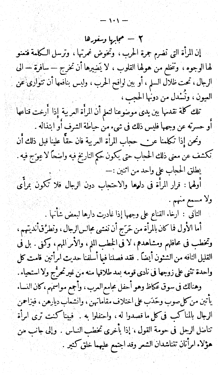تلك كلمة نقدمها بين يدي موضوعنا لتعلم أن المرأة العربية إذا أرخت قناعها أو حسرته عن وجهها فليس ذلك قي شيء من خياطة السرف أو ابتذاله.