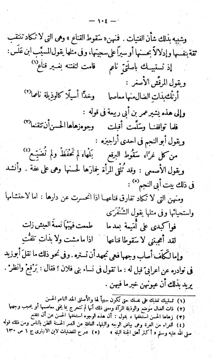 ومنهن التي لا تكاد تفارق قناعها إذا انحسرت عن دارها: إما لاحتشامها واستحيائها وفي مثلها يقول الشَّنْفَرَي: