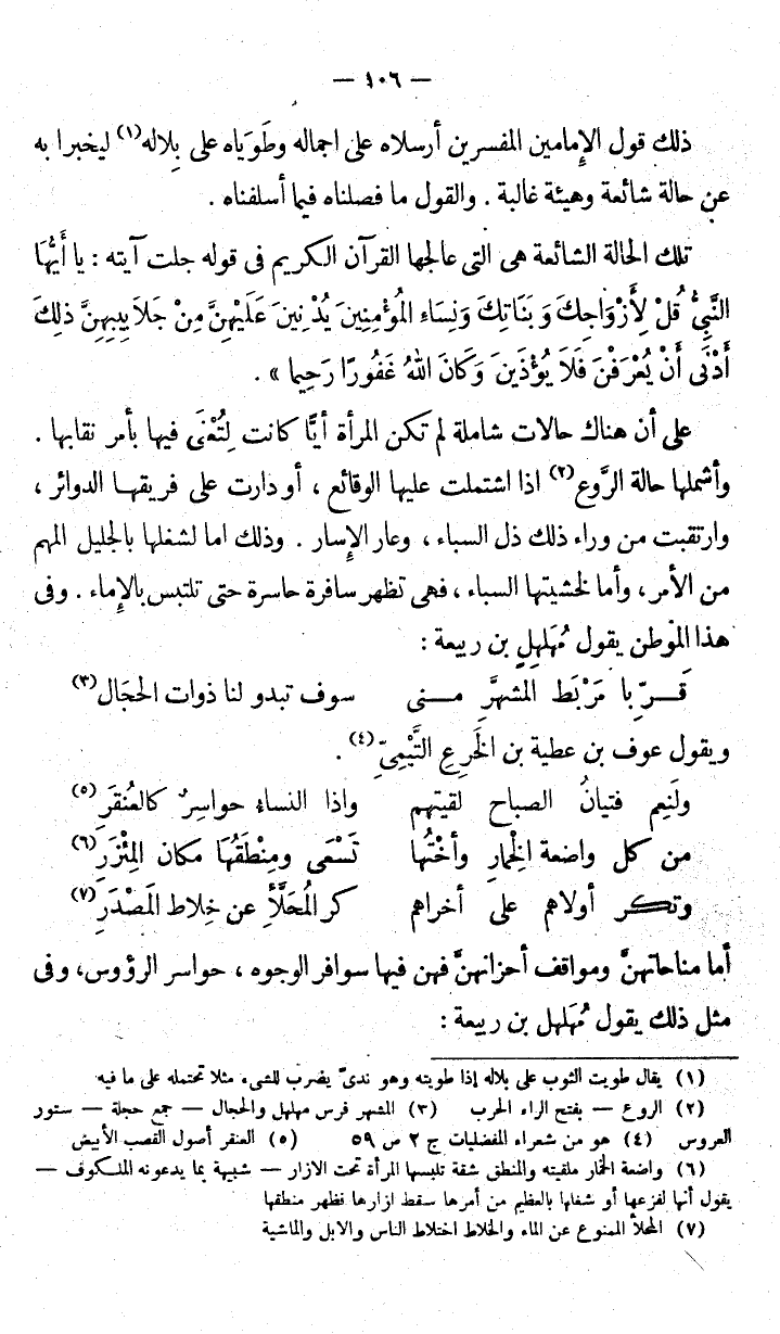 على أن هناك حالات شاملة لم تكن المرأة أياًّ كانت لتُعني فيها بأمر نقابها. وأشملها حالة الروع إذا اشتملت عليها الوقائع، أو دارت على فريقها الدوائر، وارتقبت من وراء ذلك ذل السباء وعار الإسار. وذلك إما لشغلها بالجليل المهم من الأمر. وإما لخشيتها السباء، فهي تظهر سافرة حاسرة حتى تلتبس بالإماء. وفي هذا الموطن يقول مُهَلهِلٍ بن ربيعة: