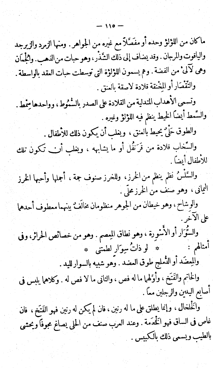 ما كان من اللؤلؤ وحده أو مفَّصَّلاً مع غيره من الجواهر. ومنها الزمرد والزبرجد والياقوت والمرجان. وقد يضاف إلى ذلك الشذْر، وهو حبات من الذهب والْجُمَان وهي لآلئ من الفضة. وهم يسمون اللؤلؤة التي توسطت حبات العقد بالواسطة. والتَّقْصَار أو الِمْخنقة قلادة لاصقة بالعنق.