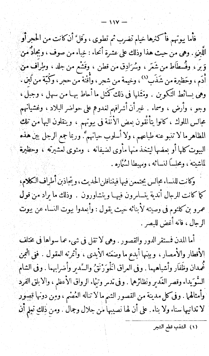 أما المدن فمستقر الدور والقصور. وهي لا تقل في شيء عما سواها في مختلف الأقطار والأمصار، وبينها أبدع ما وضعته الأيدي، وأثمرته العقول. ففي غُمدان وظفار وأشباههما. وفي العراق الخَوَرْنَقُ والسَّدير وأضرابهما. وفي الشام السُّوَيداء وقصر الغَدير ونظائرهما. وفي تدمر وتيماء الرواق الأعظم، والأبلق الفرد وأمثالهما. وفي كل مدينة من القصور الشمم ما لا تناله العُصْم، ومن دونها قصور لا تدانيها سناء ولا بناء. على أن لها نصيبها من جلال وجمال. ومن ذلك تعلم أن