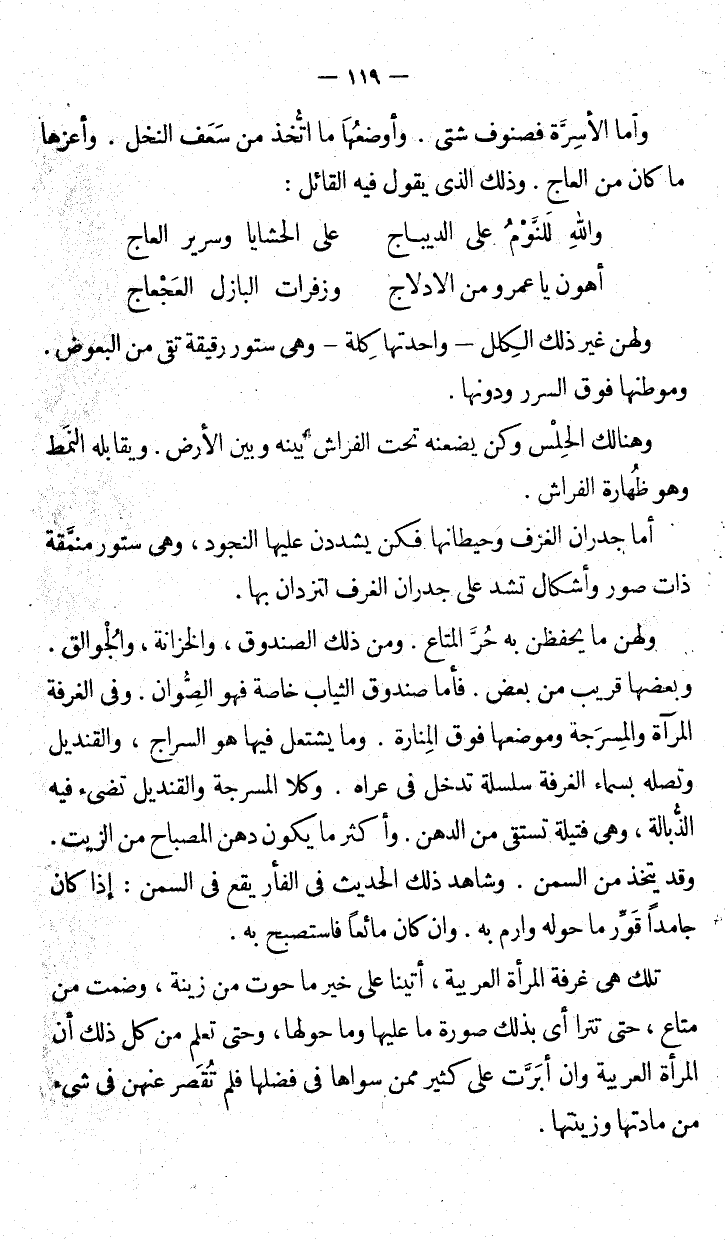 تلك هي غرفة المرأة العربية، أتينا على خير ما حوت من زينة، وضمت من متاع، حتى تتراءى بذلك صورة ما عليها وما حولها، وحتى تعلم من كل ذلك أن المرأة العربية وإن أَبرت على كثير ممن سواها في فضلها فلم تقتصر عنهن في شيء من مادتها وزينتها.