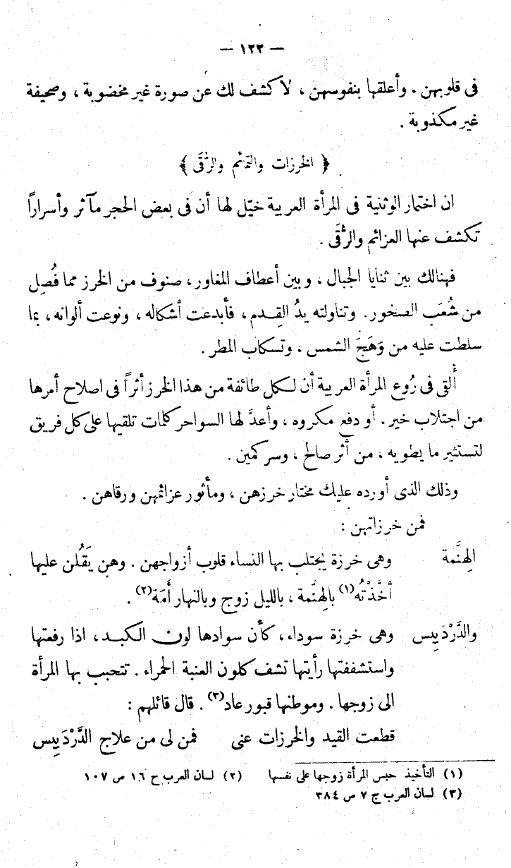 ألقى في روع المرأة العربية أن لكل طائفة من هذا الخرز أثراً في إصلاح أمرها من اجتلاب خير، أو دفع مكروه، وأعد لها السواحر كلمات تلقيها على كل فريق لتستثير ما يطويه، من أثر صالح، وسر كمين.
