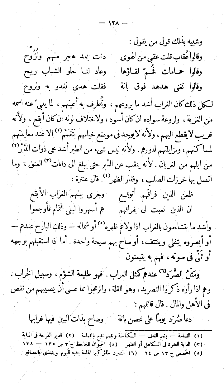 لكل ذلك كان الغراب أشد ما يروعهم، وتُطوف به أعينهم، لما ينيء عنه اسمه من الغربة، ولروعة سواده إن كان أسود، ولاختلاف لونه إن كان أبقع، ولأنه غريب لا يقطع إليهم، ولأنه لا يوجد في موضع خيامهم يَتَقَمم إلا عند معاينتهم لمساكنه، ومزايلتهم لدورهم. ولأنه ليس شيء من الطير أشد على ذوات الدَّبر من إبلهم من الغربان. لأنه ينقب عن الدّبر حتى يبلغ إلى دايات العنق، وما اتصل بها خرزات الصلب وفقار الظهر قال عنترة: