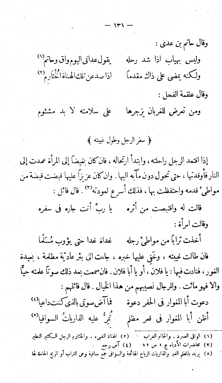 إذا اقتعد الرجل راحلته، وابتدأ ارتحاله، فإن كان بغيضاً إلى المرأة عمدت إلى النار فأوقدتها، حتى تحول دون مآبه إليها. وإن كان عزيزاً عليها قبضت من مواطئ قدميه واحتفظت بها، فذلك أسرع لعودته قال قائل: