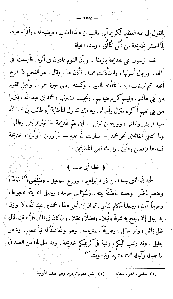 الحمد الله الذي جعلنا ذرية إبراهيم وزرع إسماعيل، وضِئضِىء مَعَد، وعنصر مُضر. وجعلنا حَضَنَة بيتهبيته، وسُوَّاس حرمه، وجعل لنا بيتاً محجوجاً، وحرما آمنا وجعلنا حكام الناس. ثم إن ابن أخي هذا محمد بن عبد الله، لا يوزن به رجل إلا رجح به شرفا ونُبلا، وفضلا وعقلا. وإن كان في المال قُل، فإن المال ظل زائل، وأمر حائل، ورعايّةٌ مسترجعة. وهو والله بَعْدُ له نبأ عظيم، وخطر جليل. وقد رغبت إليكم، رغبة في كريمتكم خديجة. وقد بذل لها من الصداق ما عاجله وآجله اثنتا عشرة أوقية ونَشا.